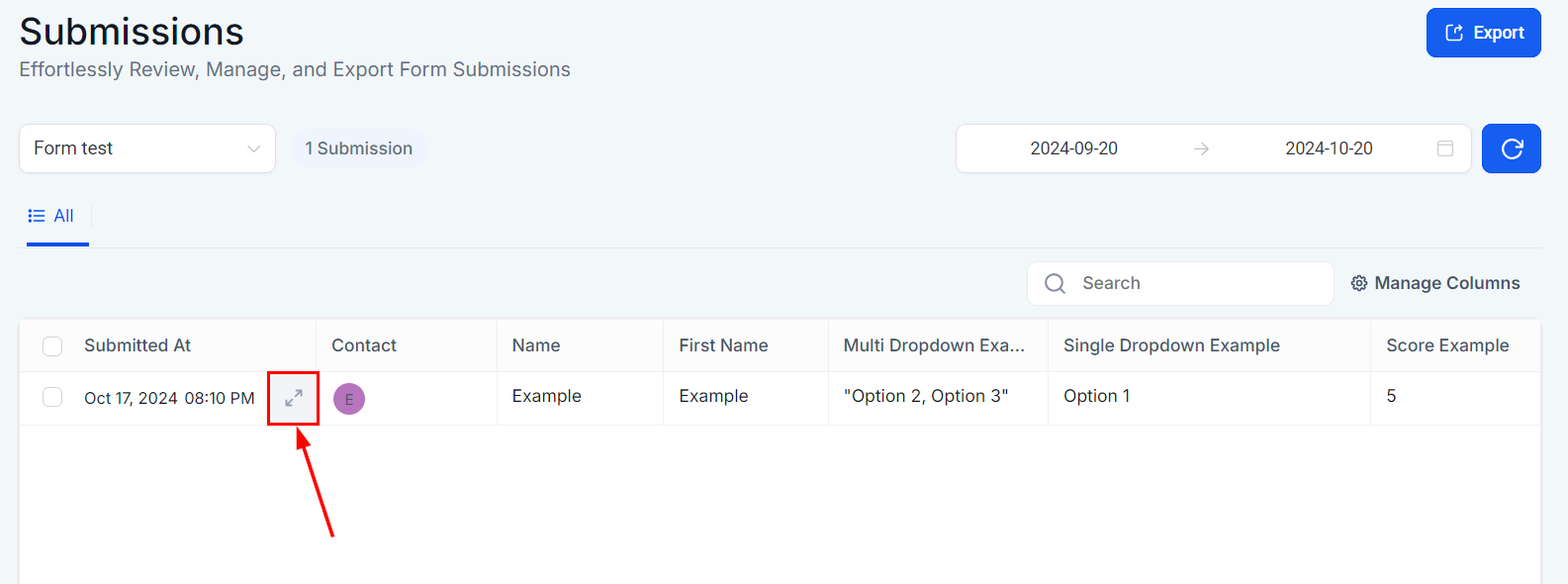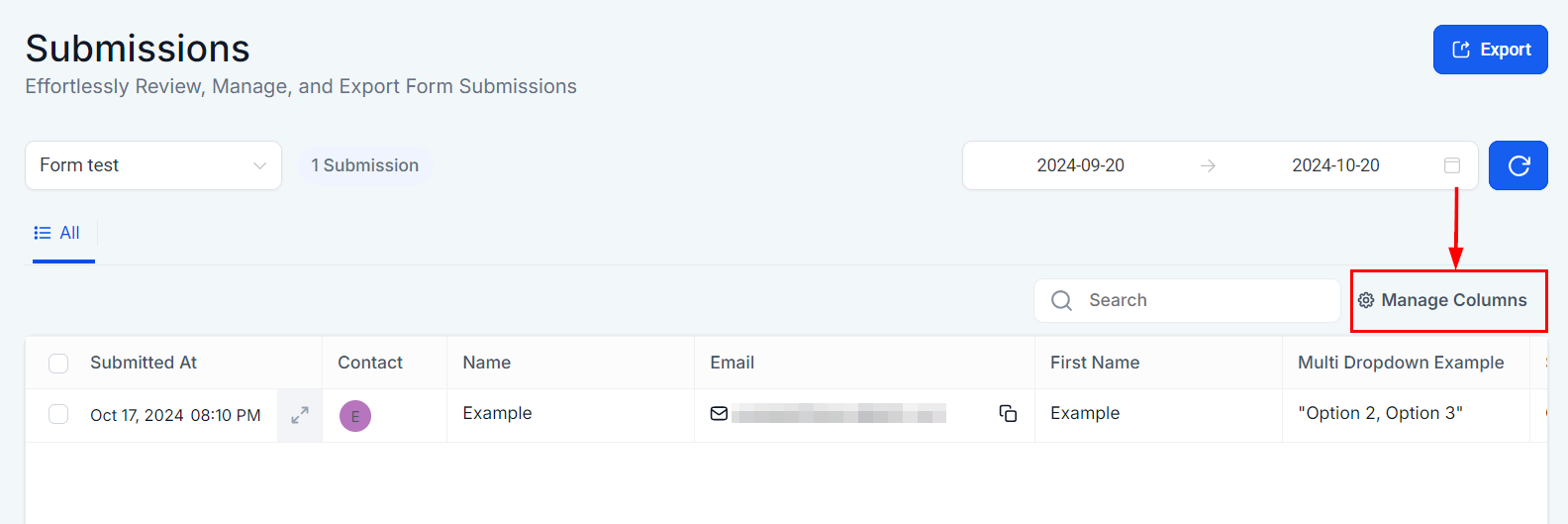Select the Manage Columns option to control the columns displayed in the Submissions table.
