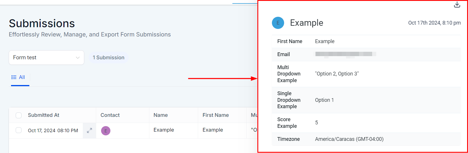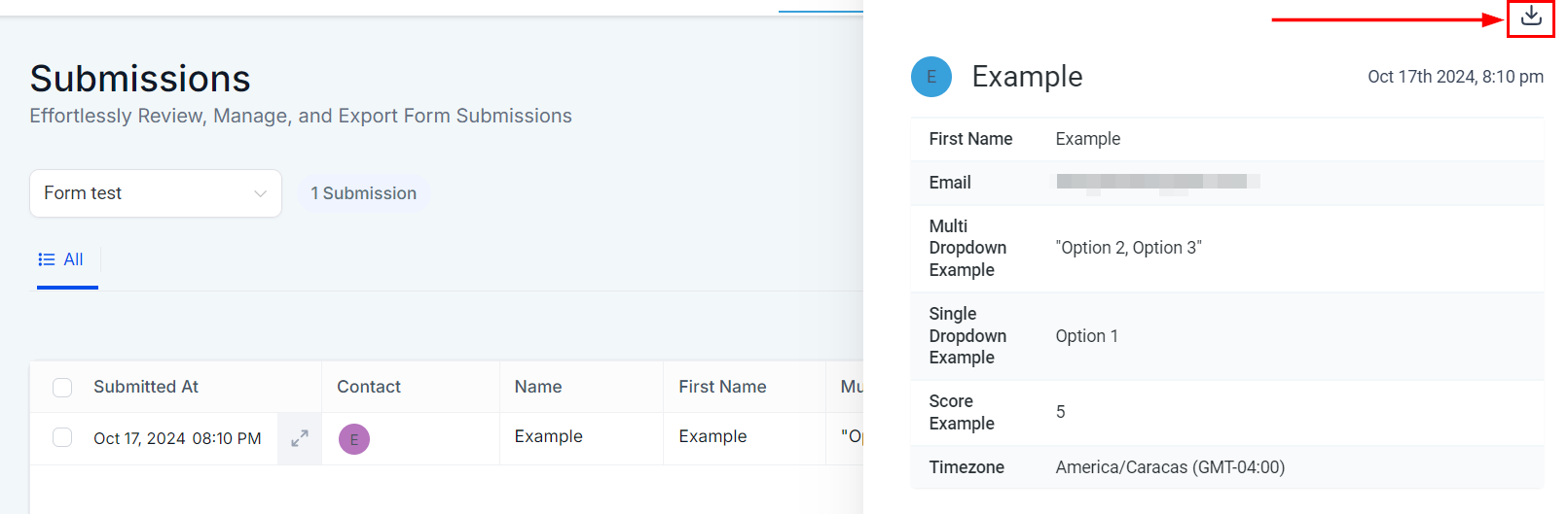 - Downloading Submissions: To download an individual submission, click the download icon after the entry is selected. Alternatively, you can download all selected submissions as a .csv file, ideal for storing in your records.