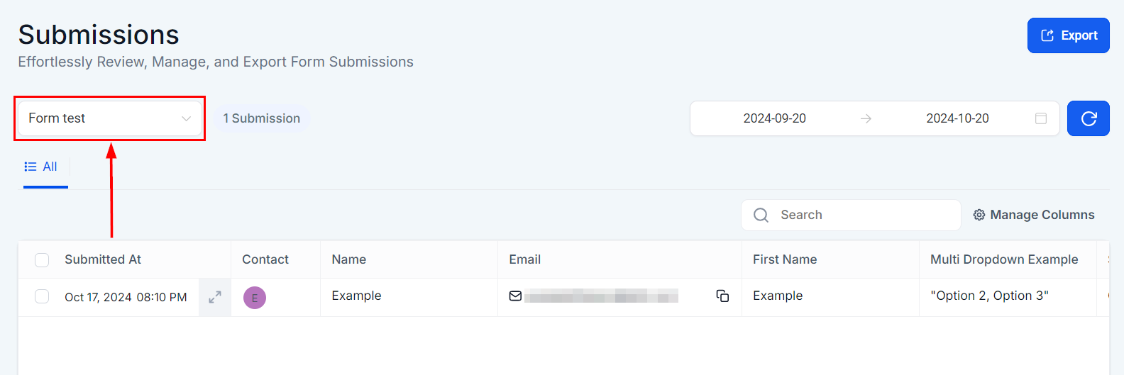 Select a particular Form whose submissions you wish to view. Alternatively, you can view all Form submissions when the “All Form” option is maintained.