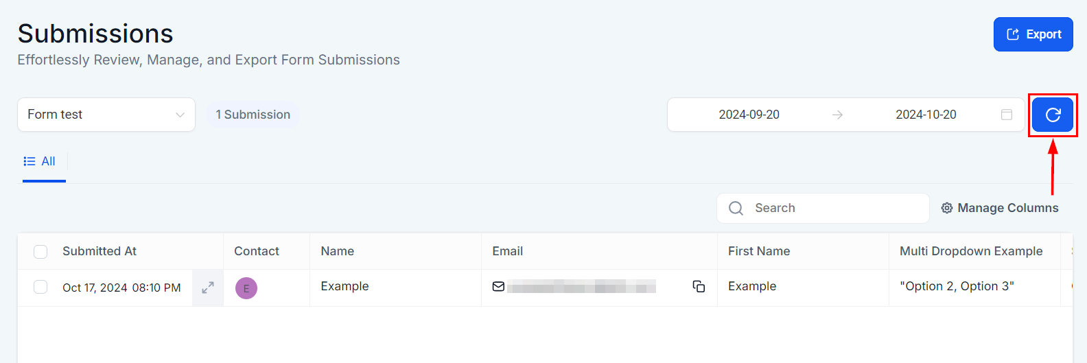 To display the most current data, simply click the refresh icon located next to the date range selector. This ensures your Form data is always up to date.