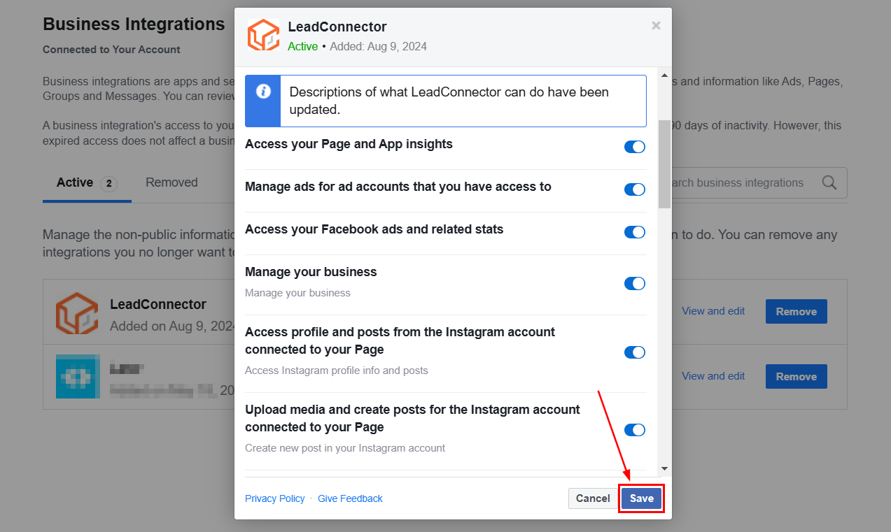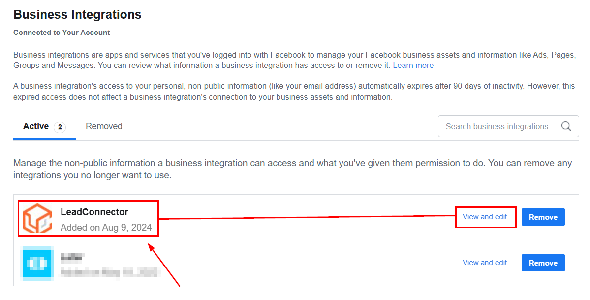 Search for the LeadConnector application in the Business Integrations. Once you find the application, click on the "View and Edit" link.