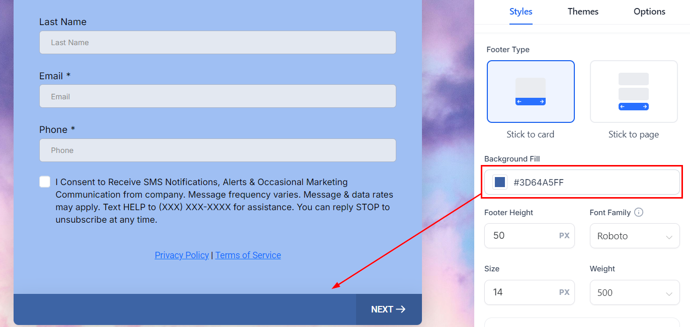 This defines the color of your footer, to change the background color, click on the color box and select a color or add a custom code.