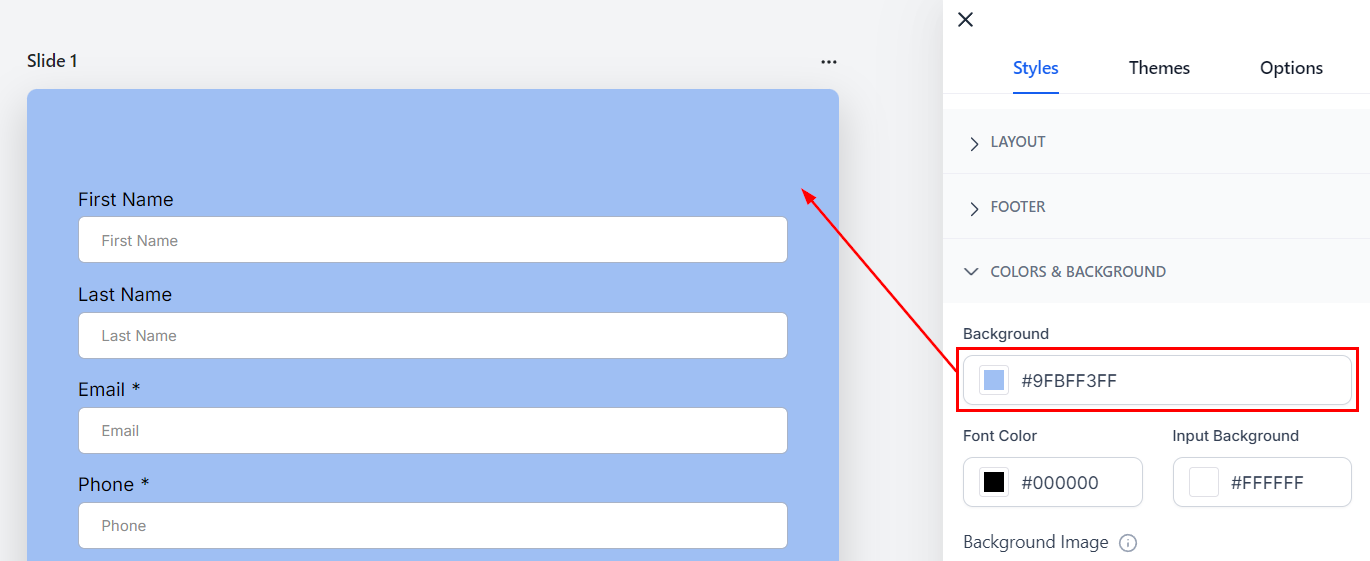 To change the background color, click on the color box and select a color or add a custom code, this will affect the general survey's background.
