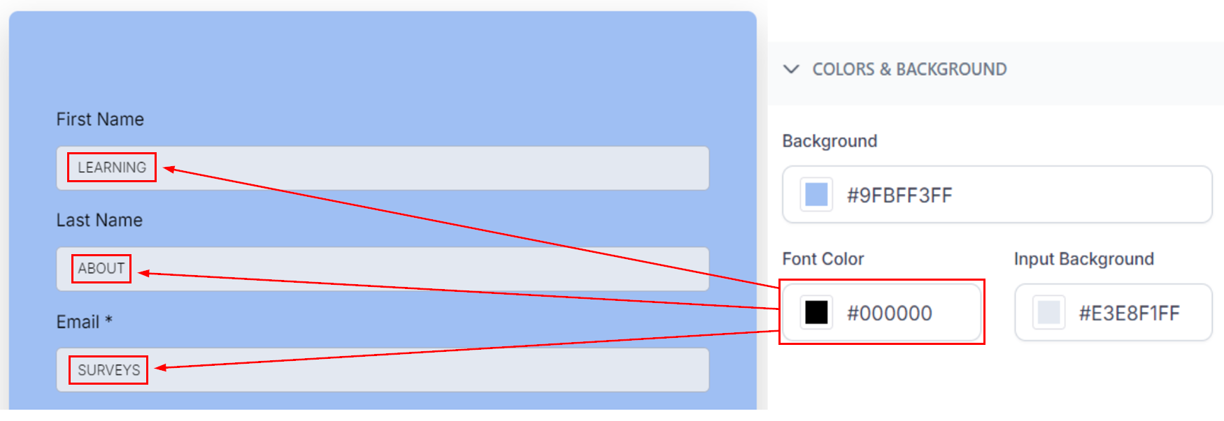 This will modify the font color user responses have when data is entered. You can see it by previewing the survey.