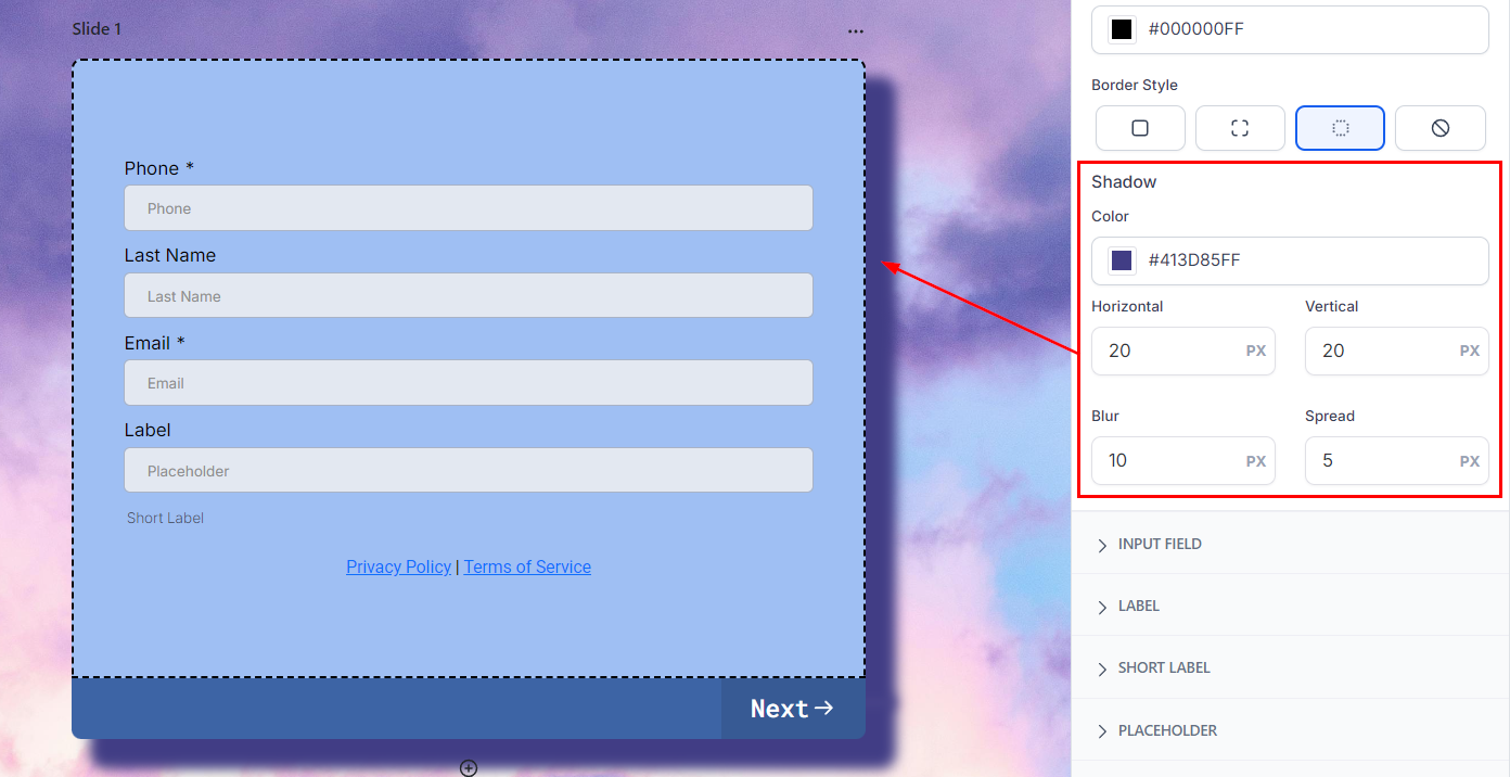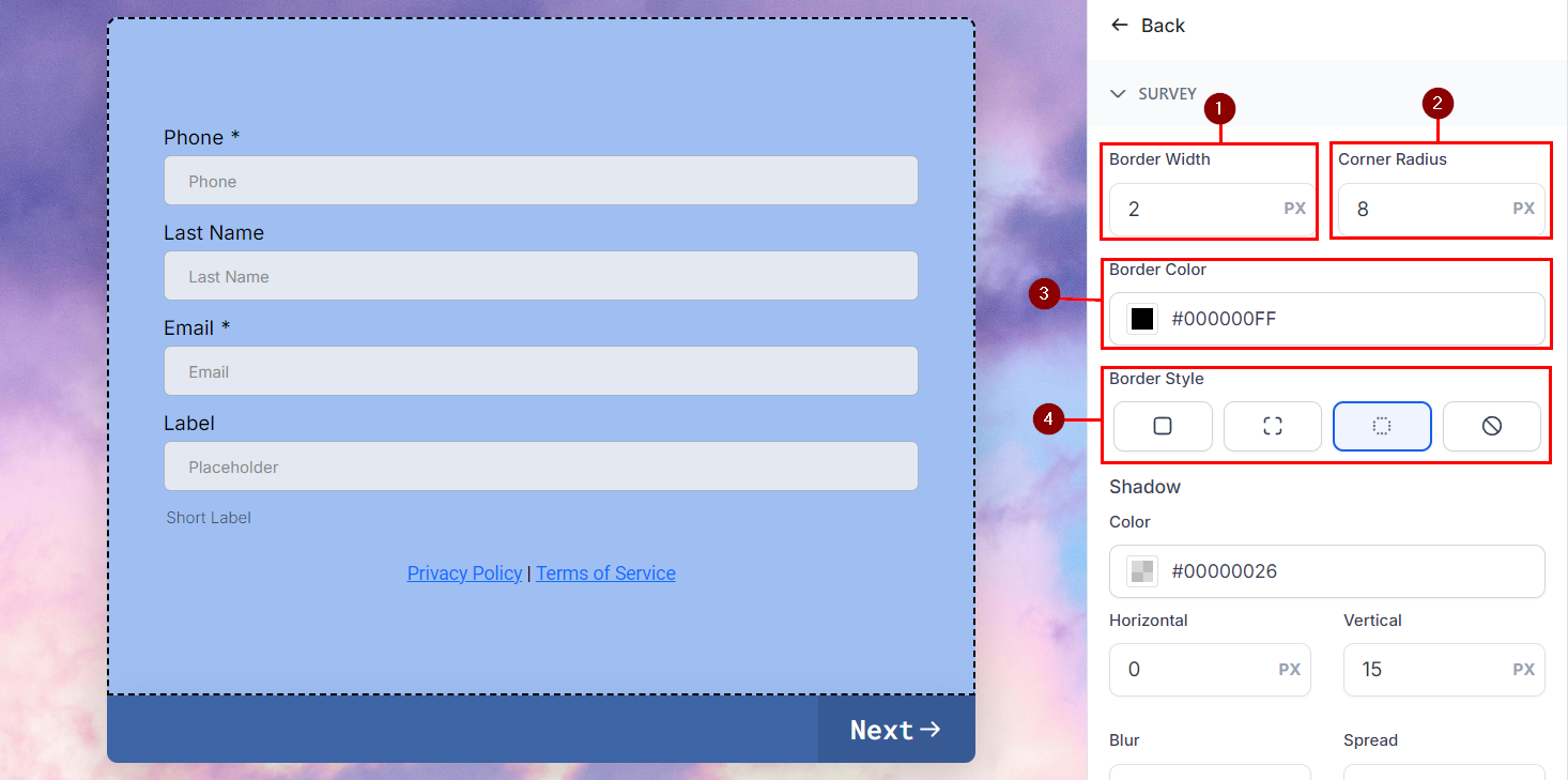 - Shadow: These options allow you to give additional depth to your survey/fields. The horizontal and vertical fields set the size, Blur sets the opacity, and Spread limits how far the shadow should extend.