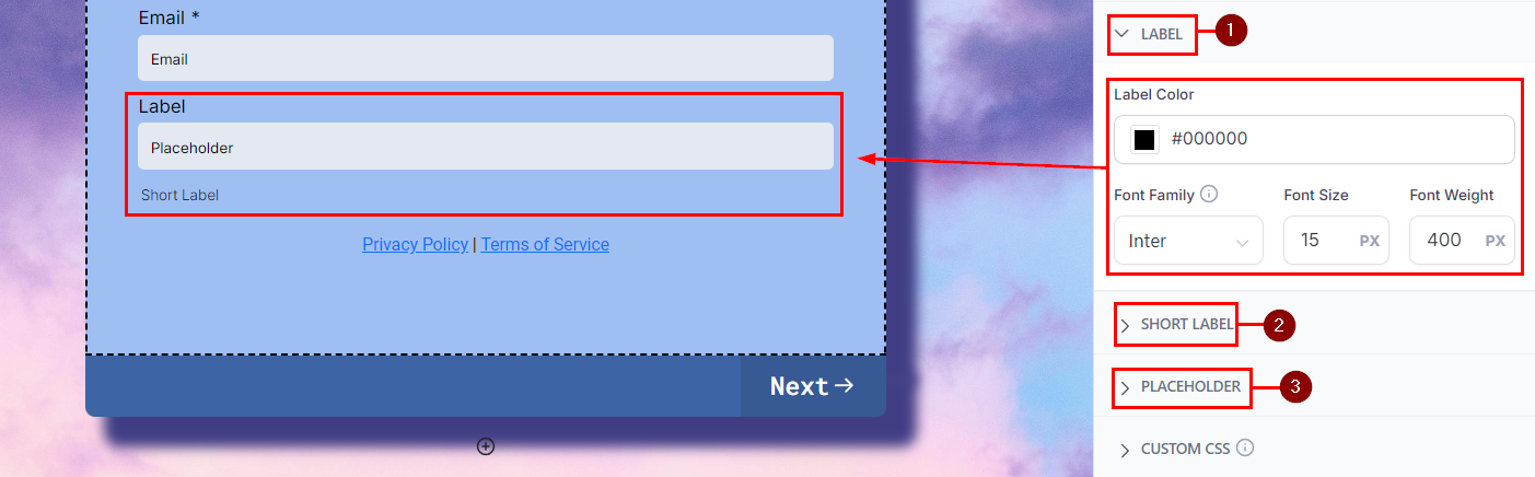 These sections allow you to change the font and its color, size, and weight for the text inside the survey. The label will be what shows on top of a field (1), the short label will show underneath (2), and the placeholder will show inside a field (3).