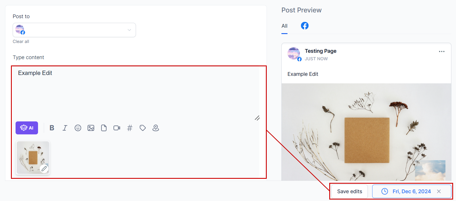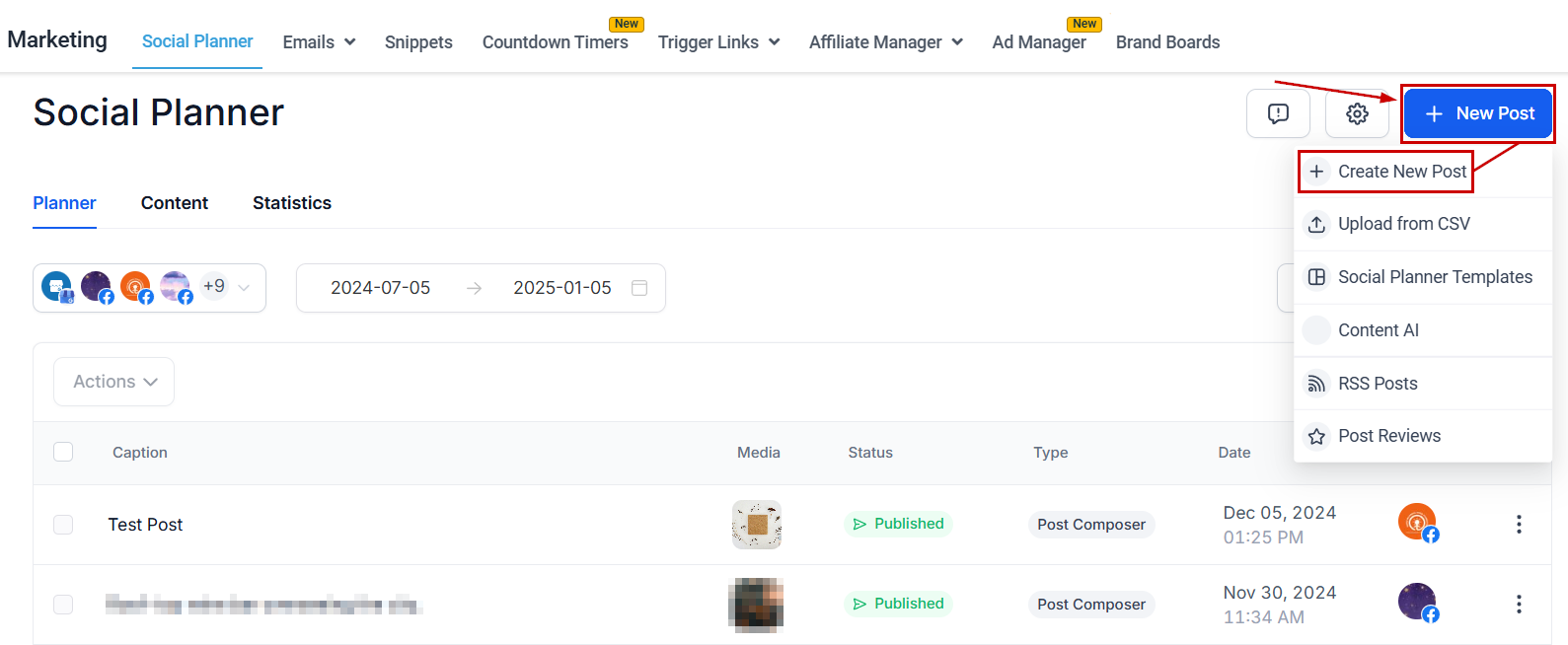 Navigate to the Social Planner inside the Marketing section. Click the “+ New Post” Button and select the “Create New Post” option.