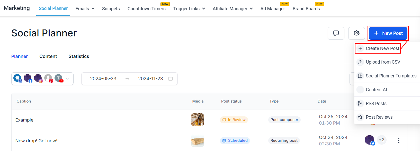 If you have several posts planned ahead of time you can create them as a CSV file and upload them at once. By uploading your posts this way you can schedule up to 90 posts per CSV. To start click on the "New Post" button and select the "Upload from CSV" option to direct you to the upload page.