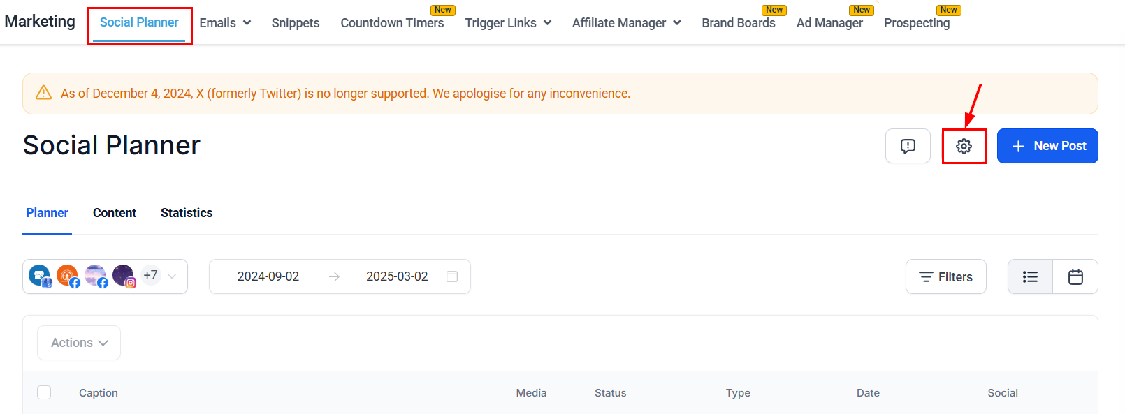 To access the Social Planner Settings, open the Marketing > Social Planner section and click the gear icon.