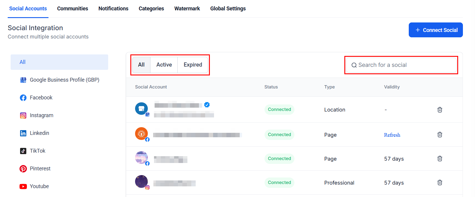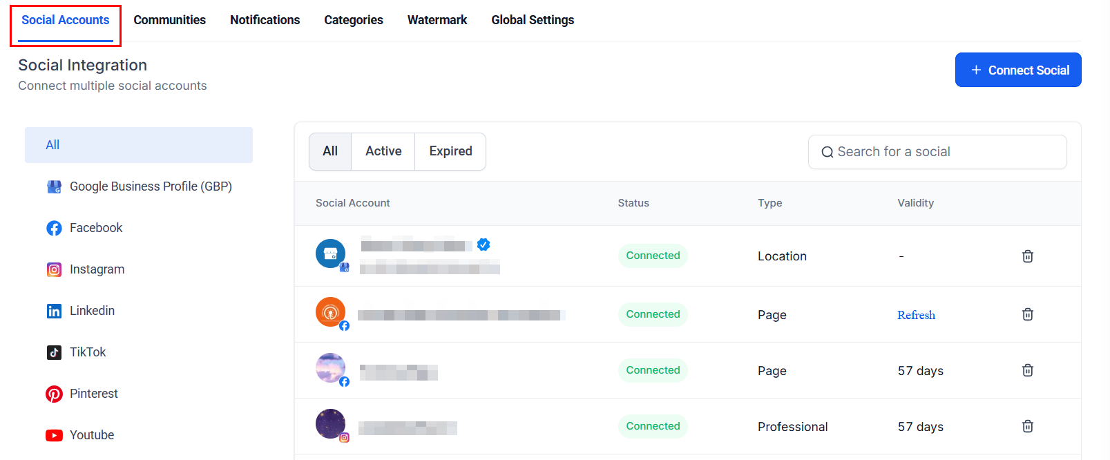 Link and manage multiple social media accounts from various platforms (such as Facebook, Instagram, LinkedIn, etc.) within this section. Click the “+ Connect Social” button to integrate a new account, or click the trash icon to disconnect a connected social account.
