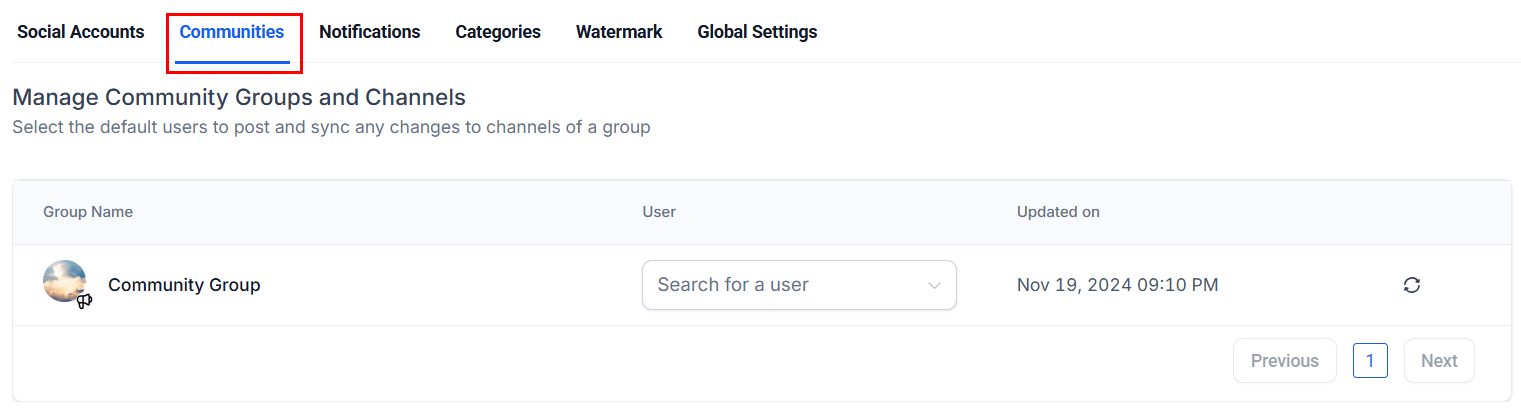 This section enables you to manage the various community groups integrated with the Social Planner. You can select default users for posting and ensure that any updates are synced across the associated channels of each group.