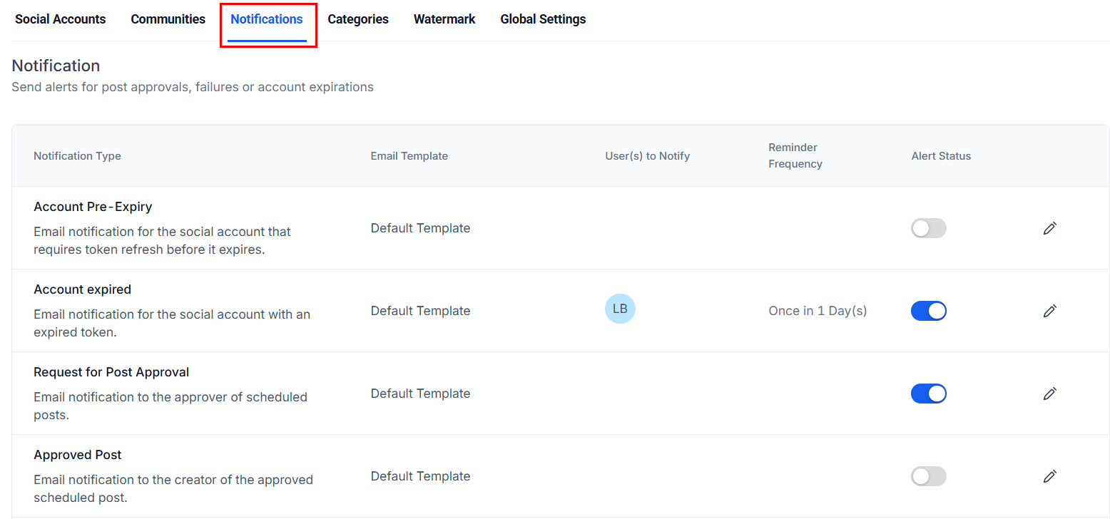 Here, you can configure how and when you receive notifications regarding your social media activities. This includes alerts for posts requiring approval, failed or rejected posts, or expired social accounts, ensuring you're always in the loop without being overwhelmed by unnecessary alerts.