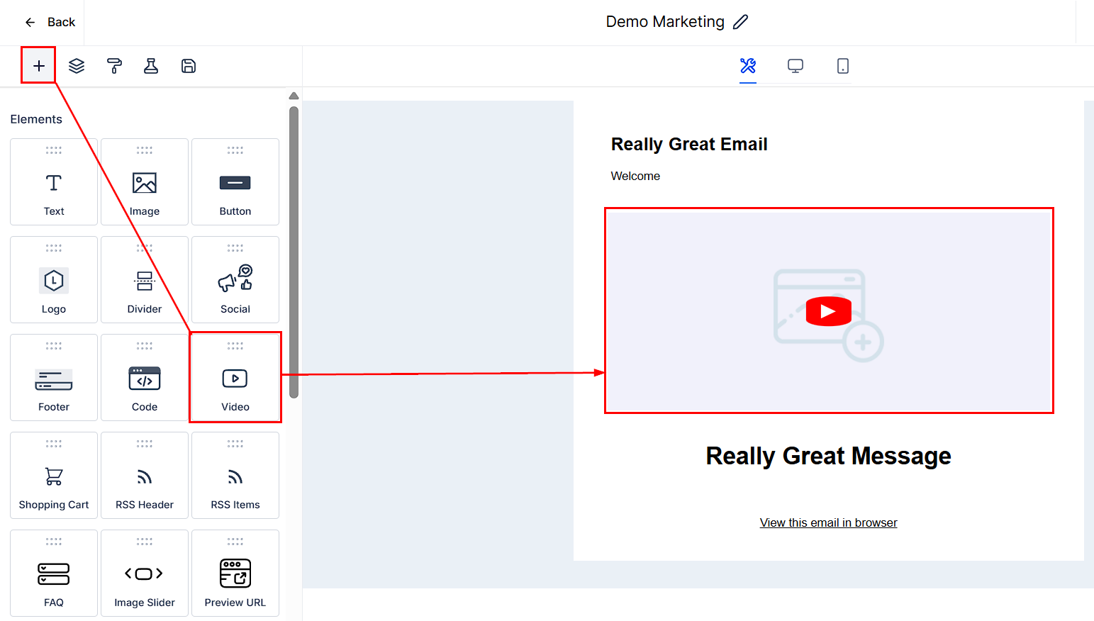 Here's where you can find this option of adding a video element in your email builder. Drag and drop the video element.