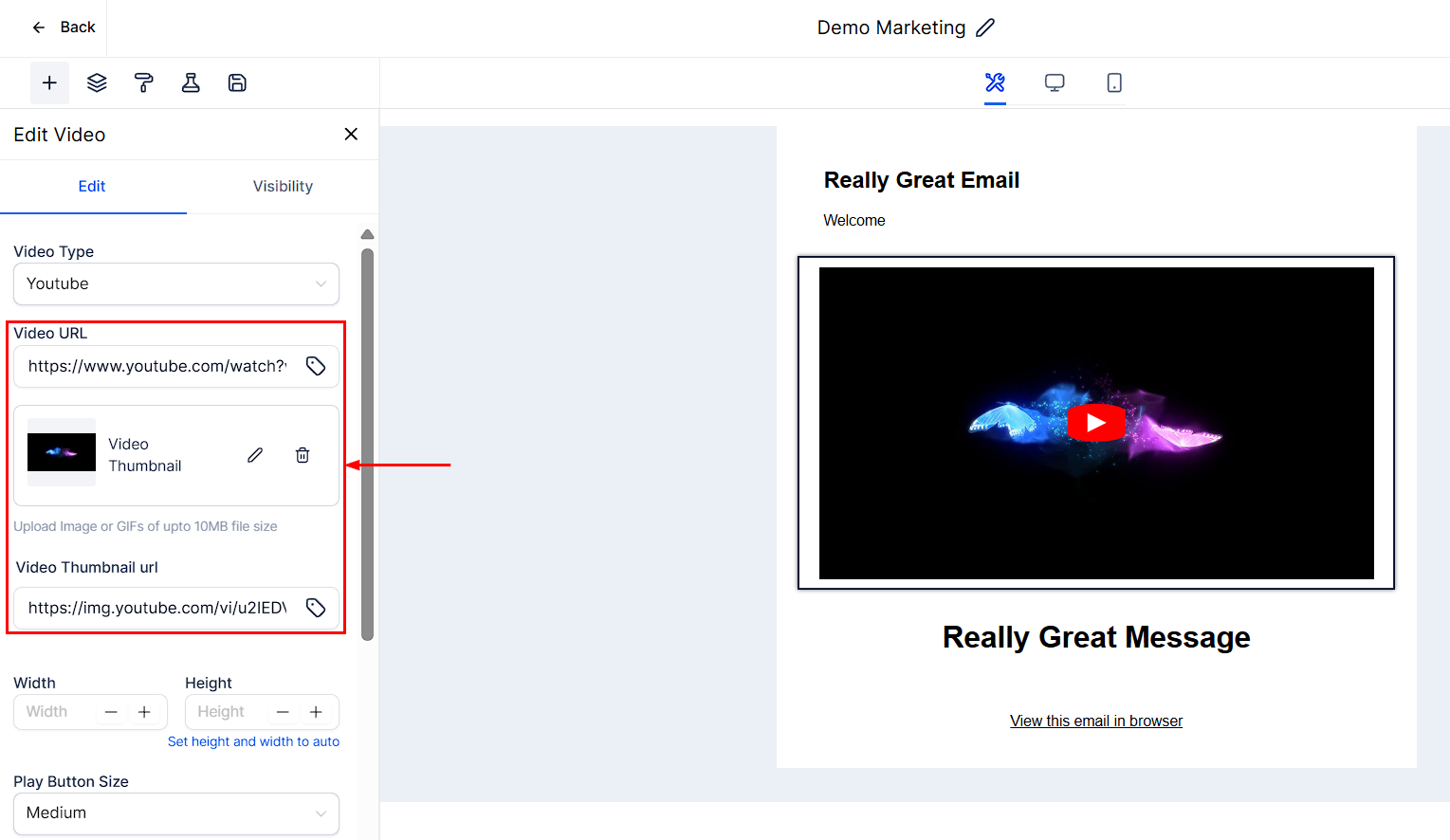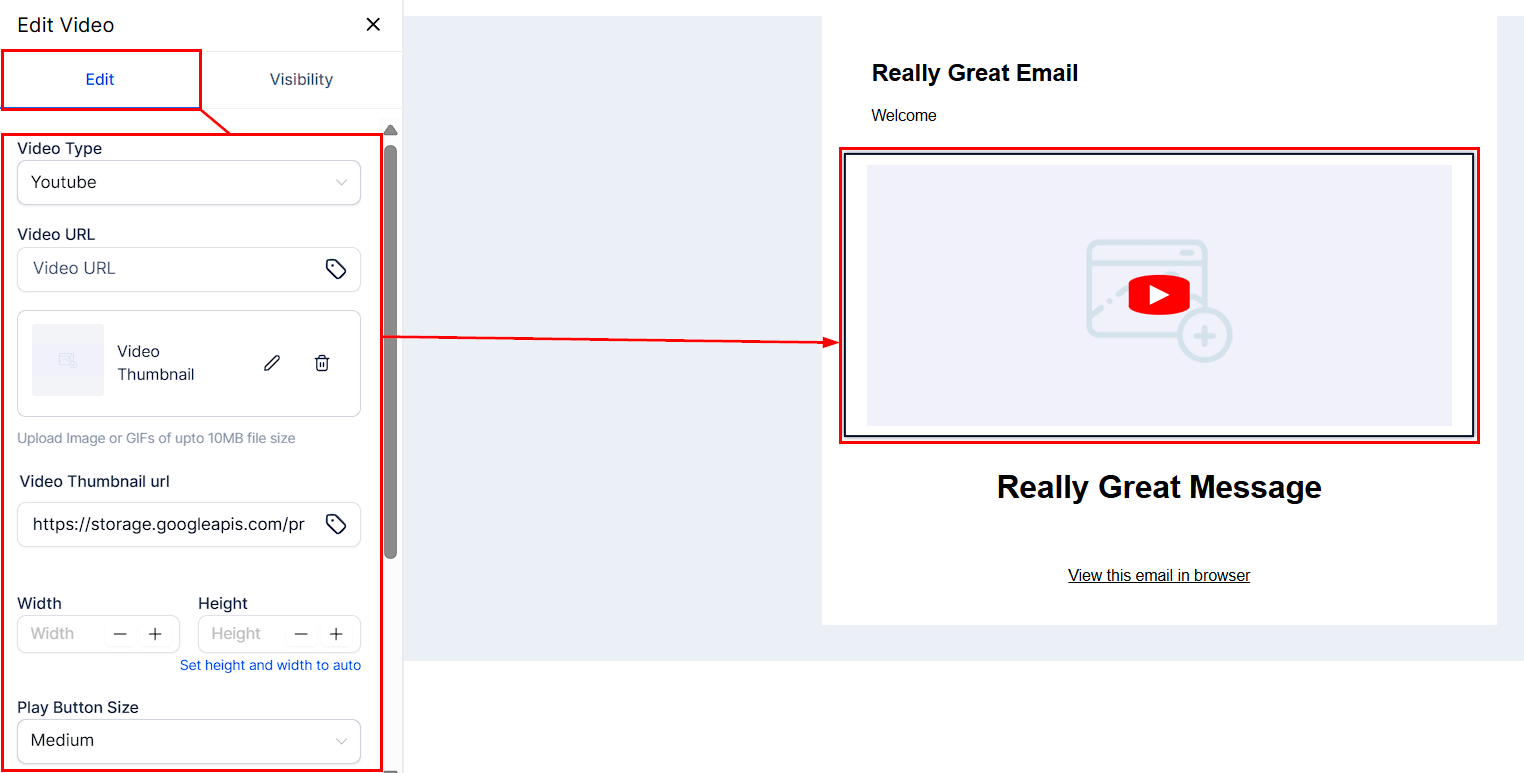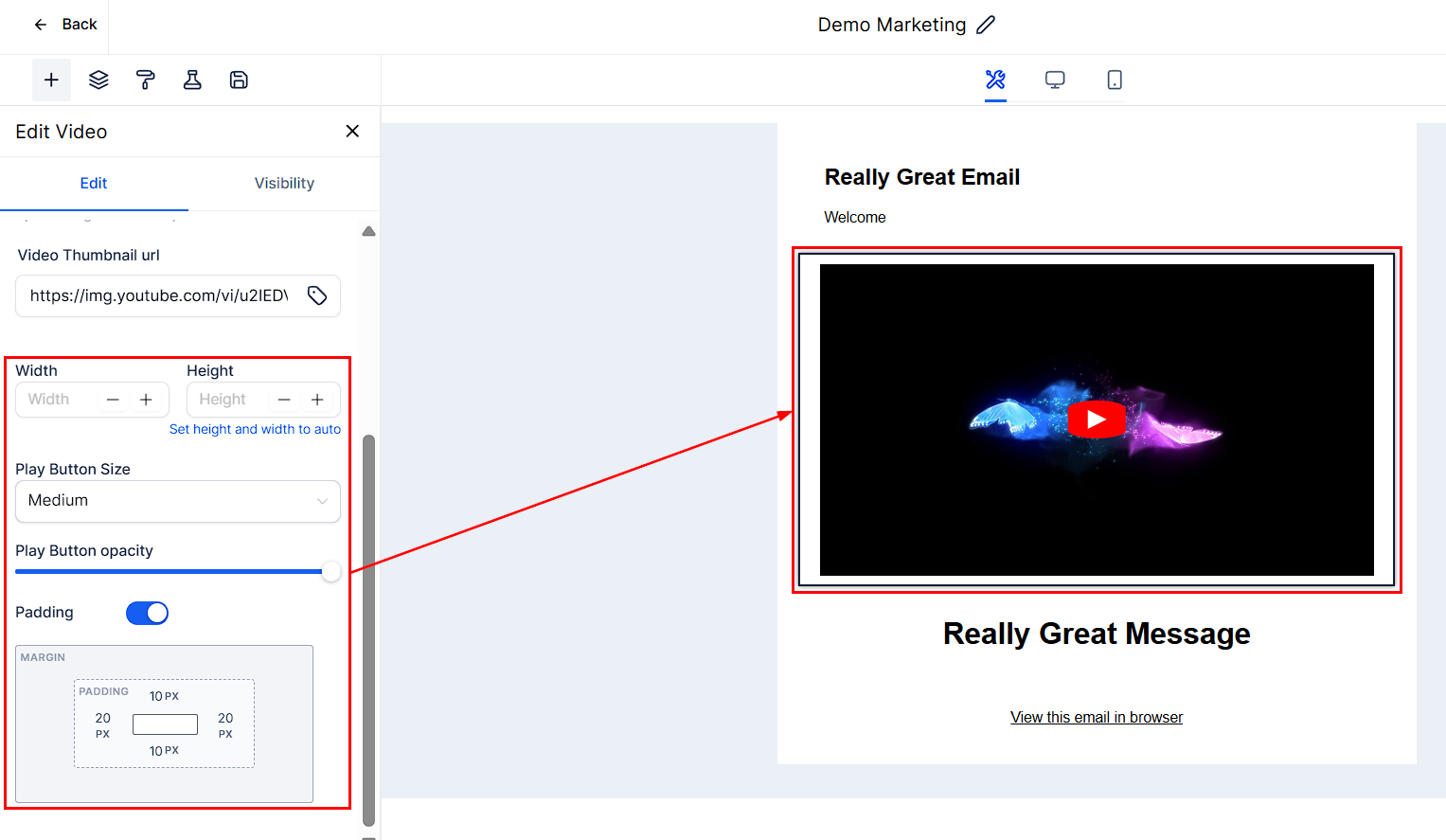Along with adjusting the size, height, width, and play button for added control. Don't forget about setting the opacity and padding to get your exact look. All these editing options are standard with our email builder.