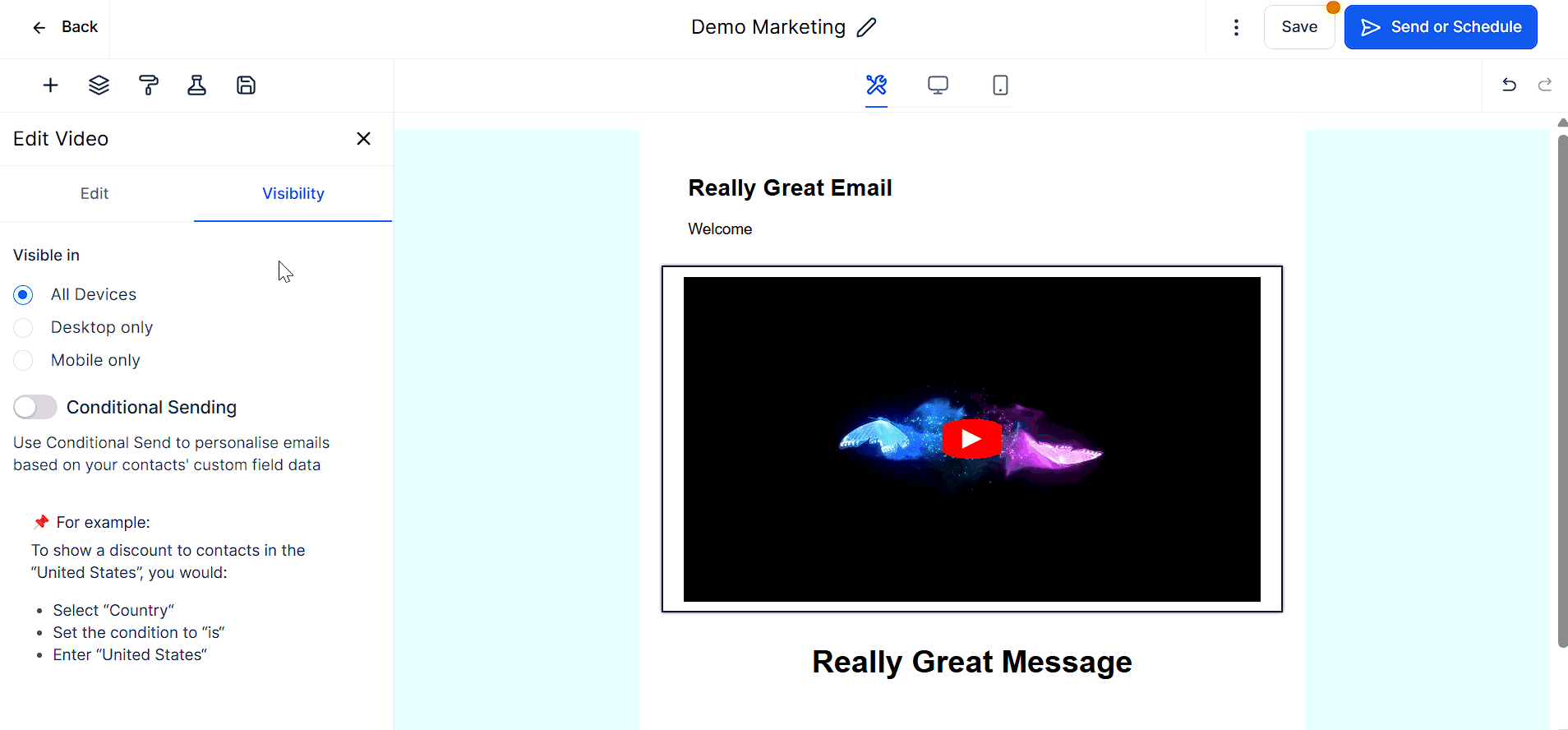 - Visible In: Control where the video appears by selecting specific device types: Desktop, Mobile, or both.