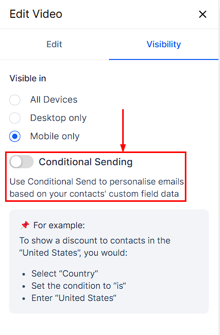 - Conditional Sending: This option enables users to customize videos based on the recipient’s custom field data.
