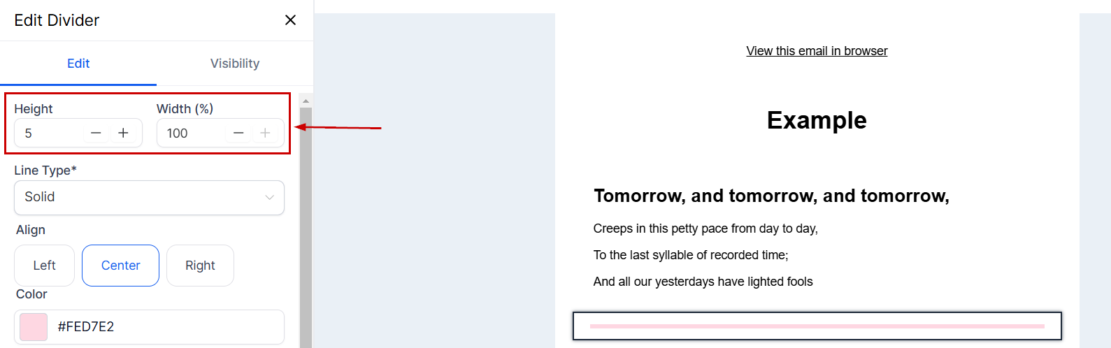 Once the divider element is added, clicking on the pencil icon in the Divider element reveals several customization options. This allows you to edit the height & width of the line and adjust its alignment accordingly.