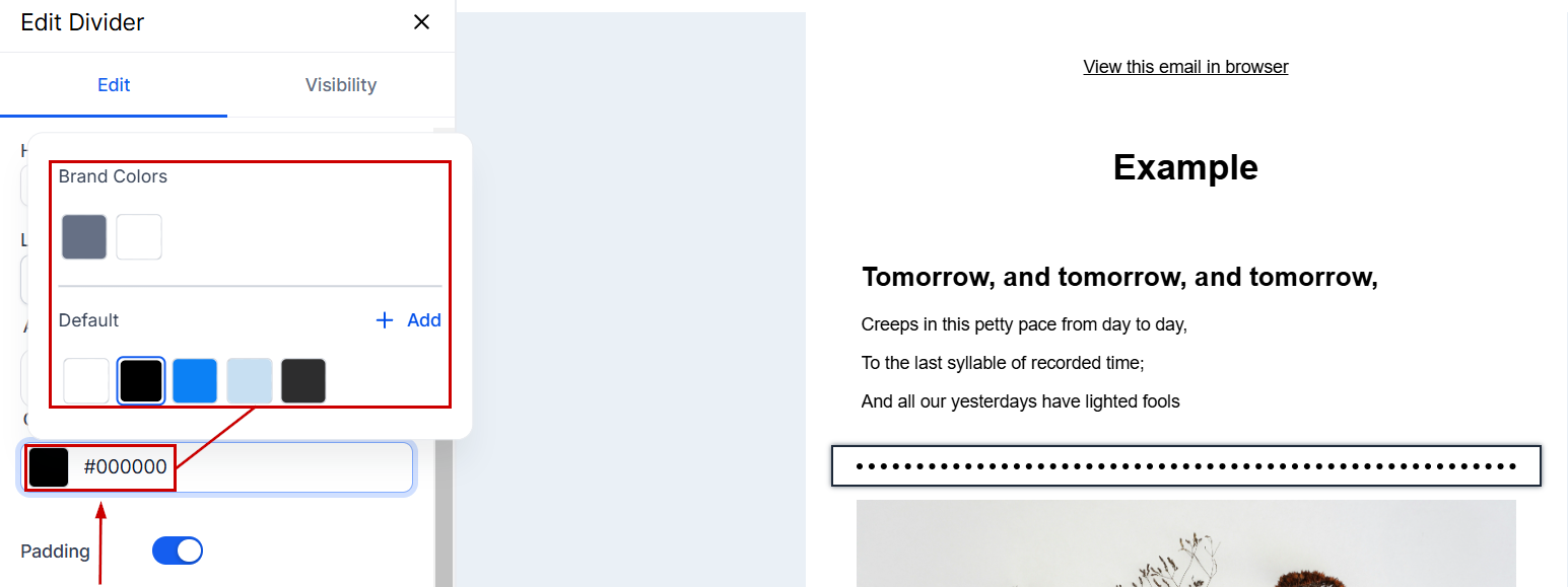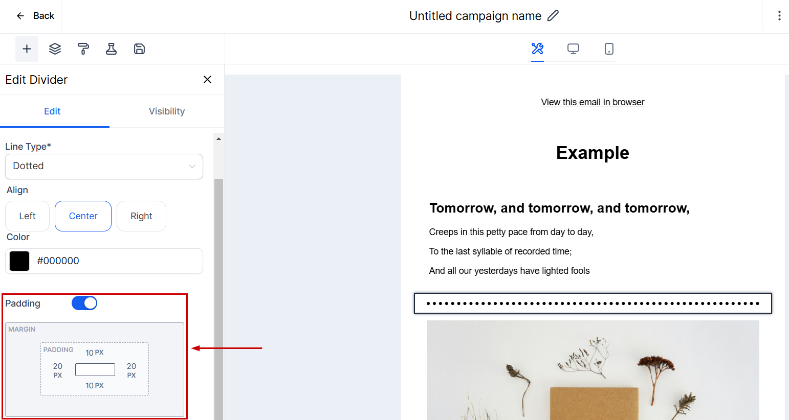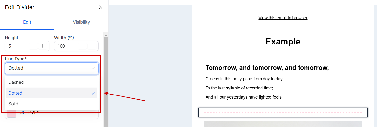 The divider element is a great tool to add structure to your emails. They help you separate text, images, and buttons, making them stand out for maximum impact. Additionally, dividers can help distinguish and set Parameters for the different sections of your page which is immensely helpful for readers trying to collect information easily.