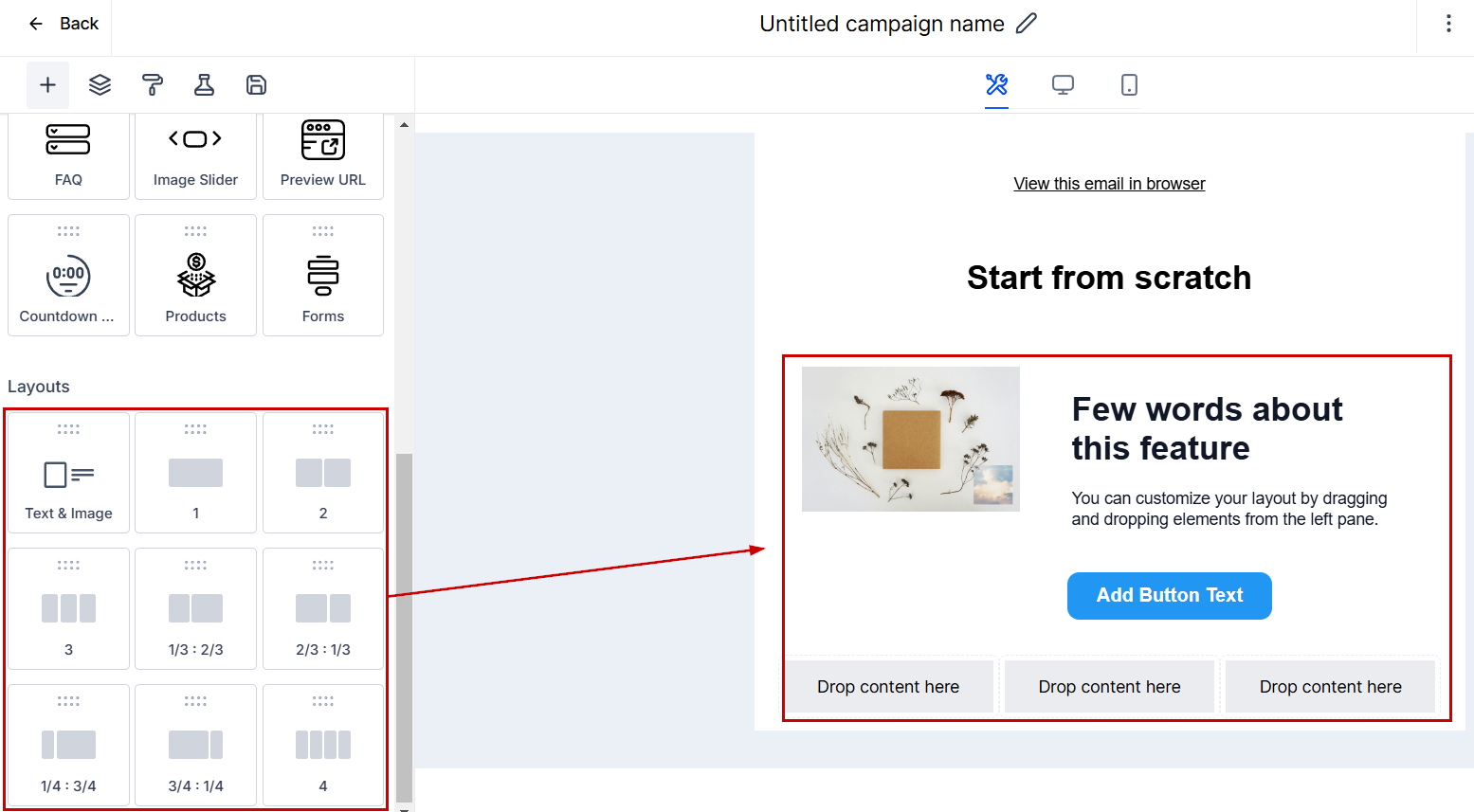 This simple drag-and-drop feature allows you to seamlessly add various layout options to your email template and customize them to meet your needs.
