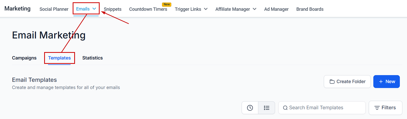 To begin, select the Templates option inside the Emails tab of the Marketing section.