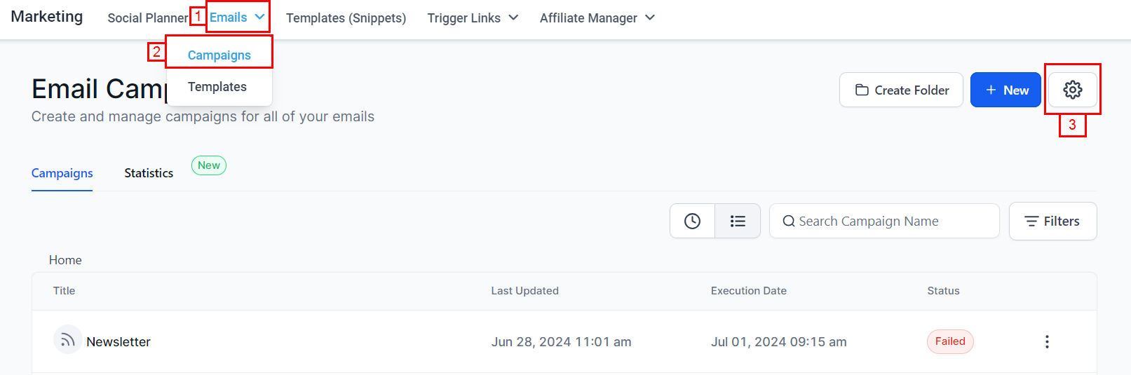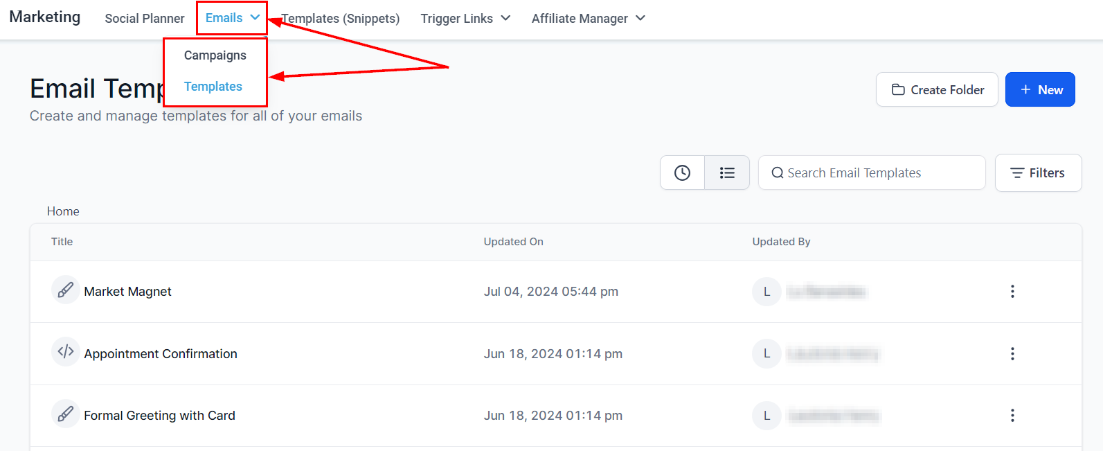 - Go to Marketing -> Emails, then access the Campaigns or Templates section.