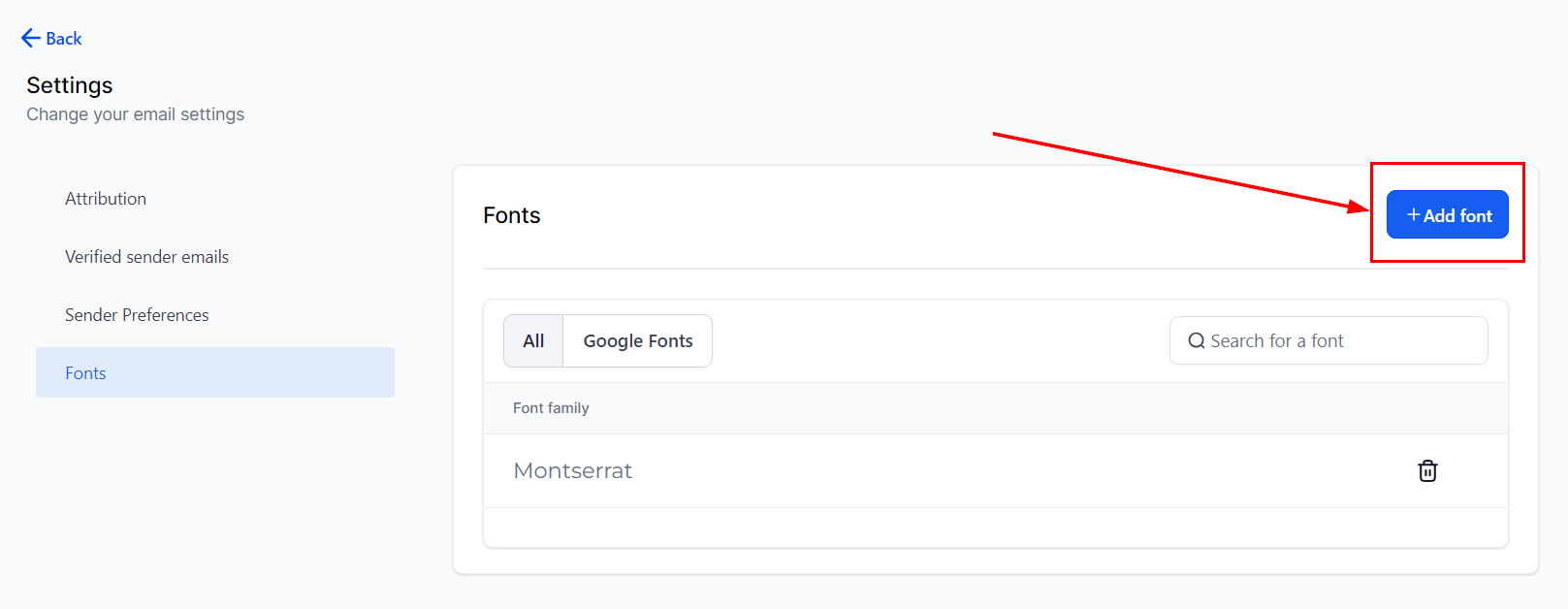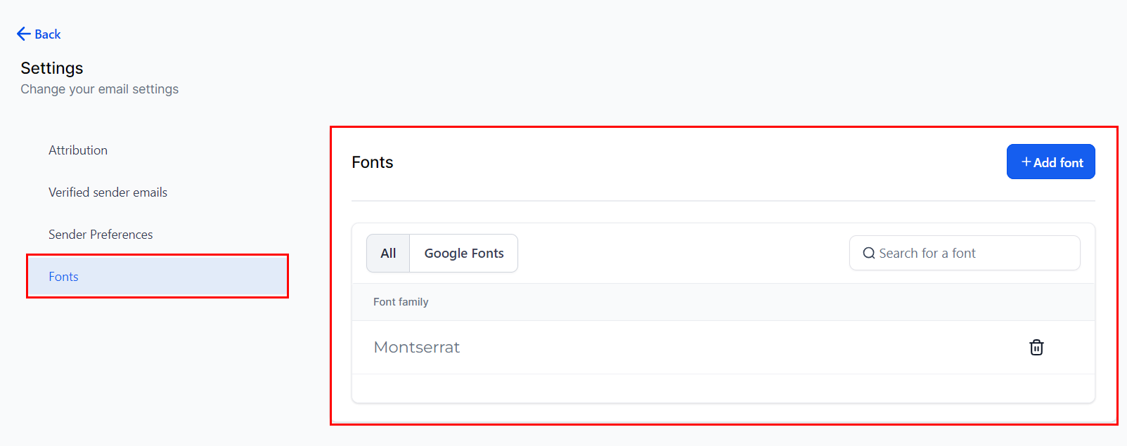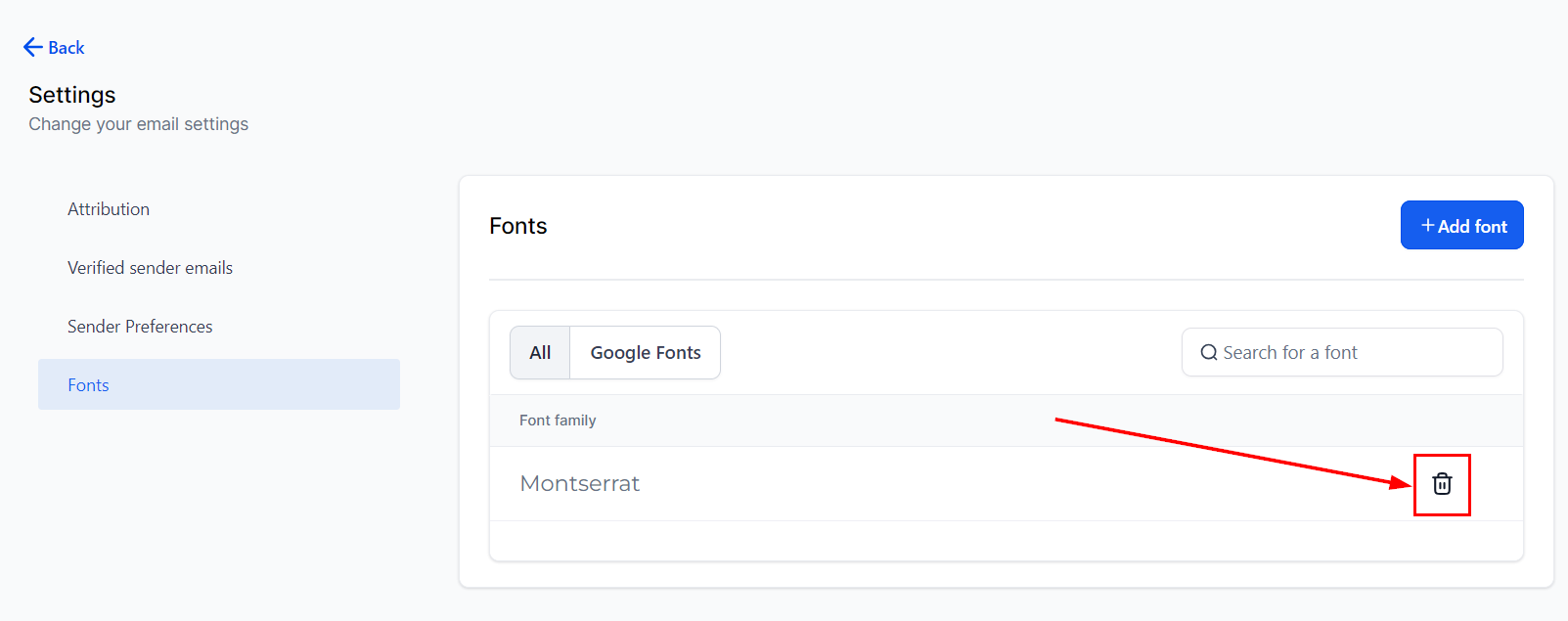 To delete a font, click the trash icon next to it. For campaigns with text already using this font, the style will remain unchanged, but the font will appear greyed out in the selector.