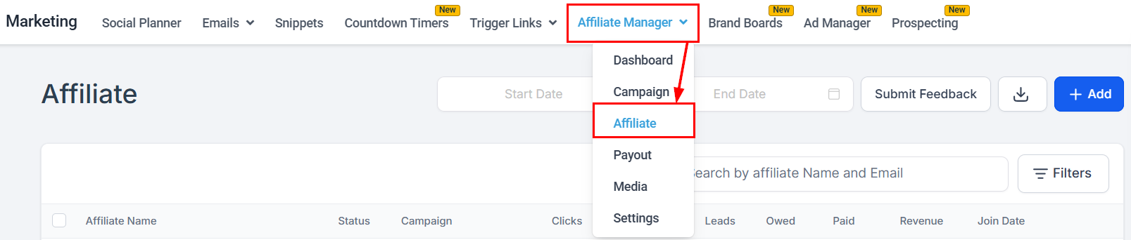 To begin adding affiliates, navigate to the Marketing section, then access the Affiliates tab from the Affiliate Manager dropdown.
