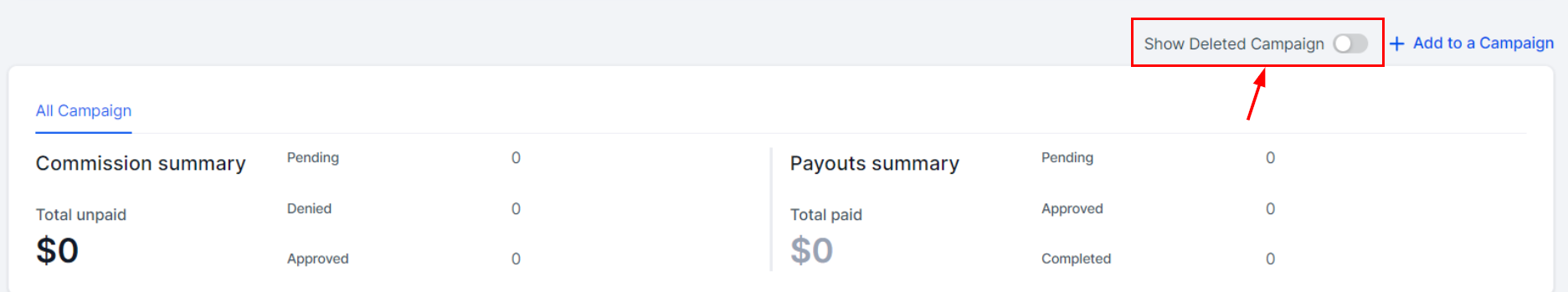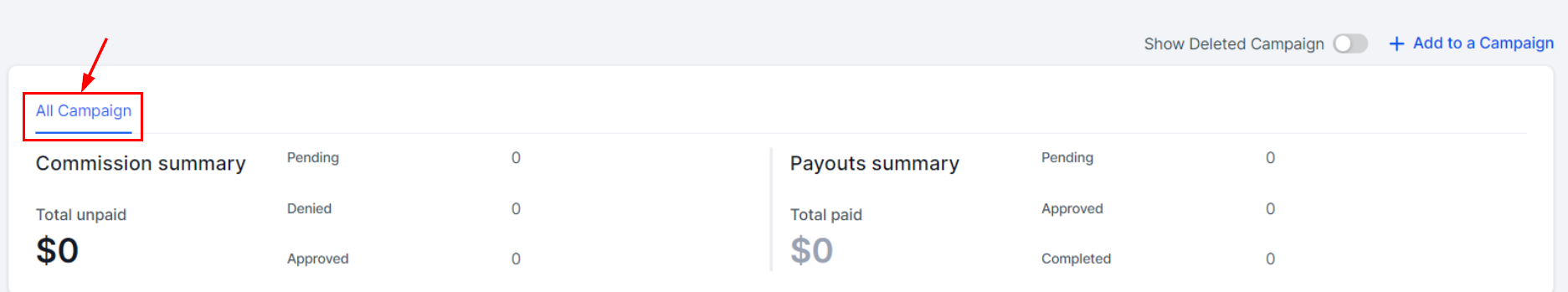 By switching to the tabs next to all campaigns you can see the summary of individual campaigns, there will be a tab for every campaign the affiliate is added to.