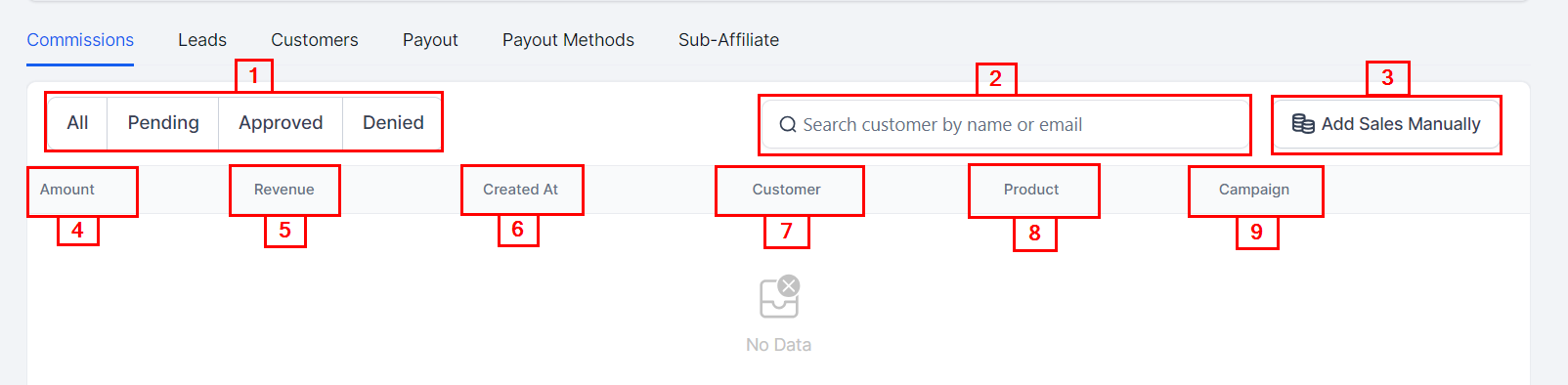 - Search Bar: With the search bar in the Commission table, you can easily and quickly search using any affiliate's customer name or email.