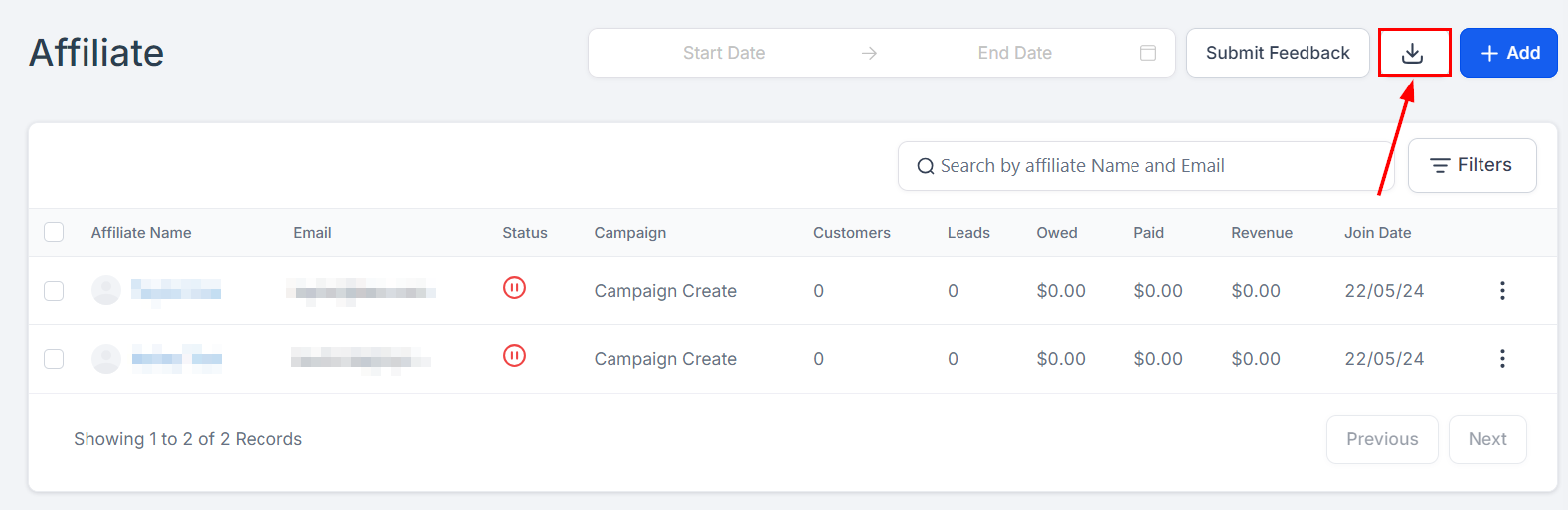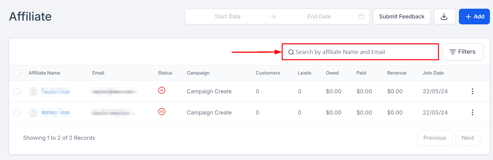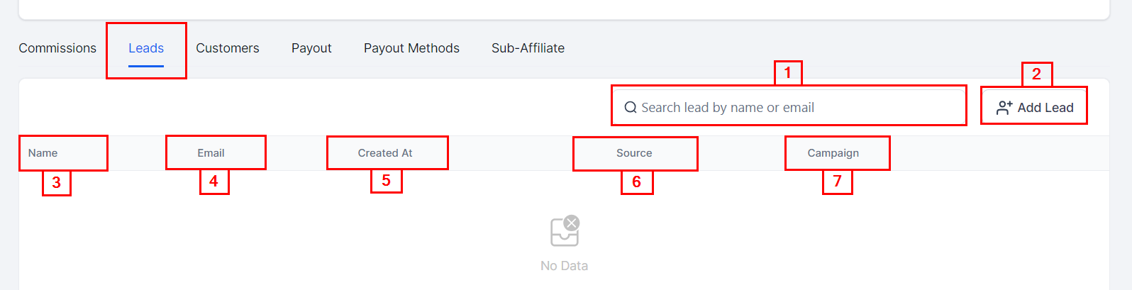- Search Bar: With the search bar, you can easily and quickly search for any lead or sub-affiliate name or email.