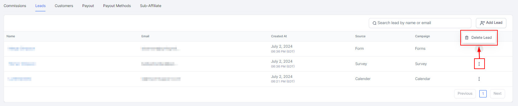 If you want to remove a lead from an affiliate, click on the three dots next to the campaign and then click Delete Lead.
