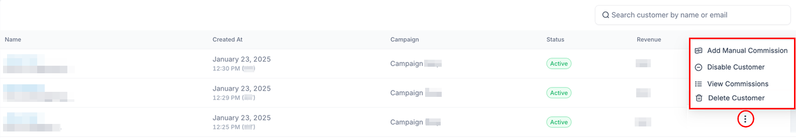 Click the three dots next to a customer to manually add commissions, view previous commissions, or delete/disable the customer.