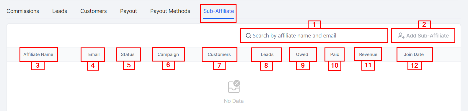 - Owed: The payout owed to each sub-affiliate will be displayed here.