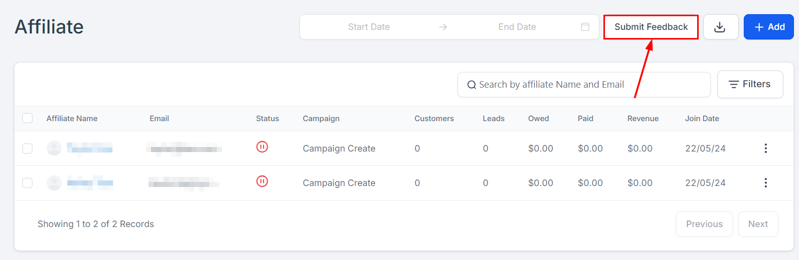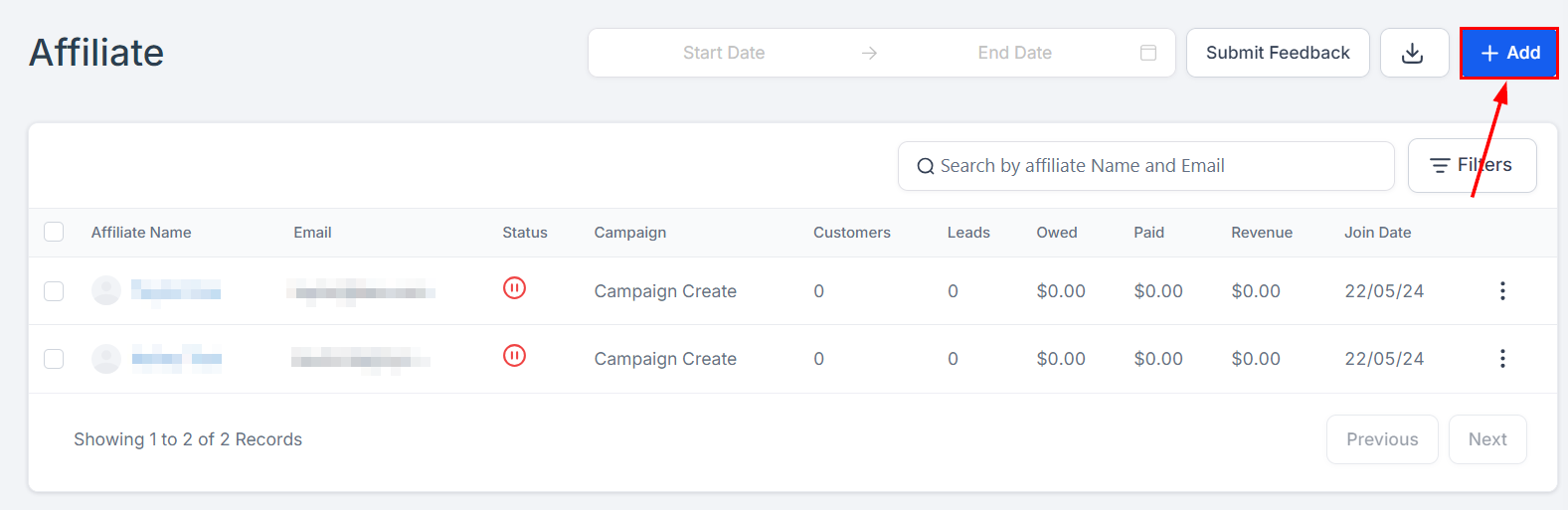 - Add Sub-Affiliate: Seamlessly add a new sub-affiliate to an existing affiliate for campaigns with a multi-tiered structure.