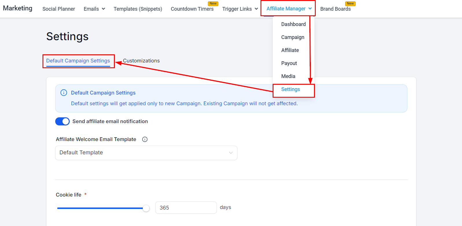 If you're running affiliate campaigns you might want to consider setting sub-affiliates. Sub-affiliates allow you to get the most out of your affiliate marketing by having your affiliate network grow your audience even more. You can enable this option from the get-go or if you have an active affiliate campaign you can add it at any point.To start go to your Affiliate Manager inside the Marketing section and access your Settings. Inside Settings, you should see Default Campaign settings pop up.