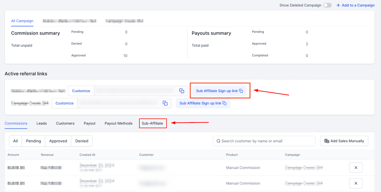 When you enable this option for a campaign each affiliate will get a Sub Affiliate sign-up link and the sub-affiliates will be under their profile.