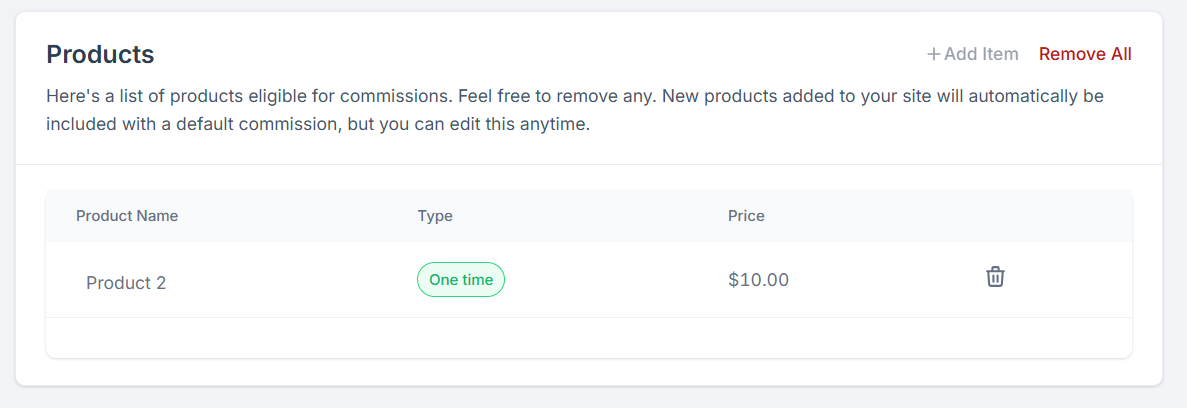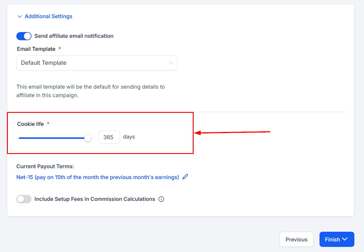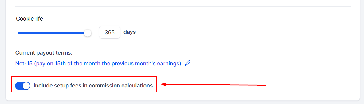 For any products with set-up fees, toggle the button for the option so you can include them in the commissions for your affiliates. This will be reflected in the total payout once processed.