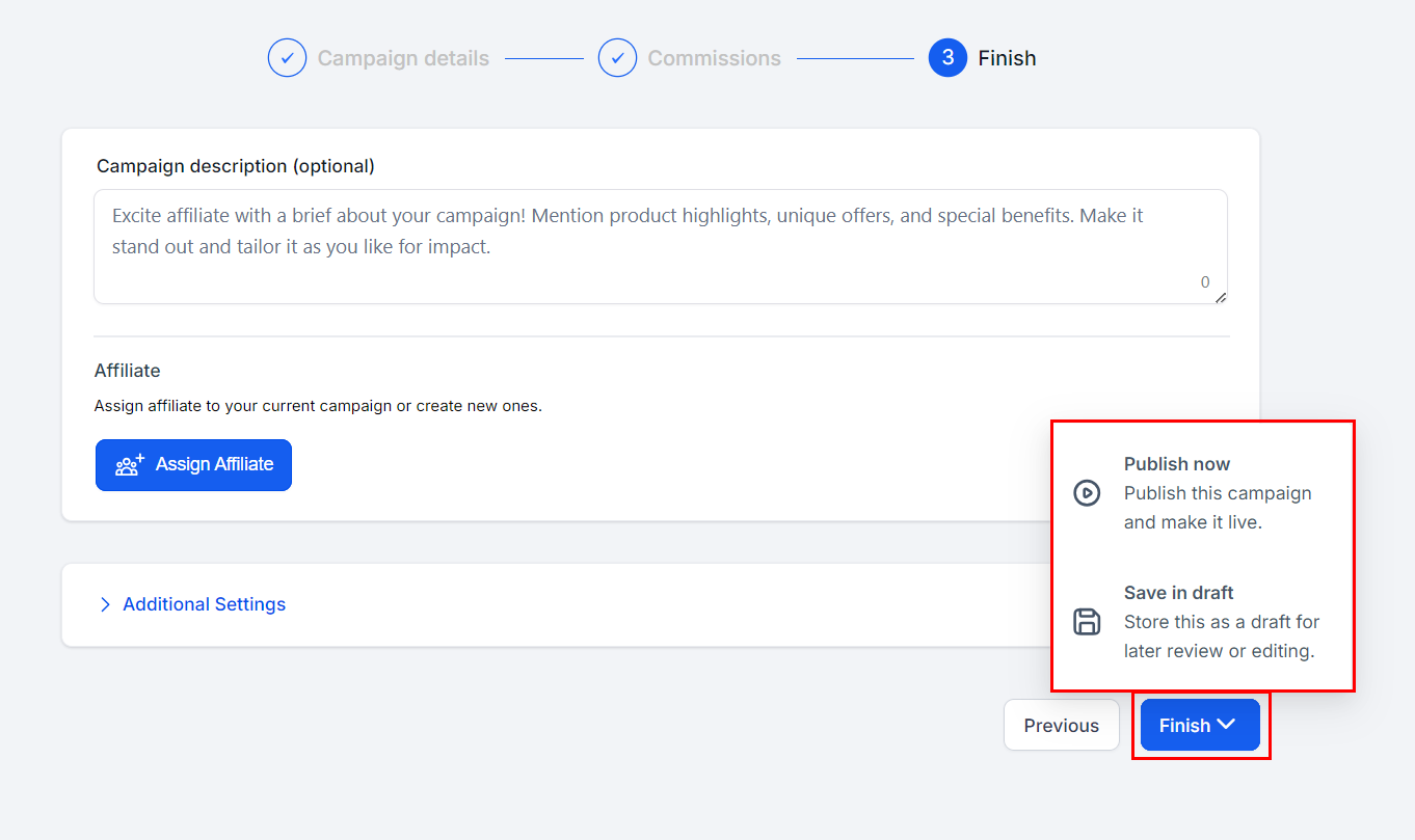 The final step is to click "Finish" and select "Publish Now" to make your campaign active and ready. If you prefer to save the campaign without making it live, select "Save in Draft" to keep the campaign paused.