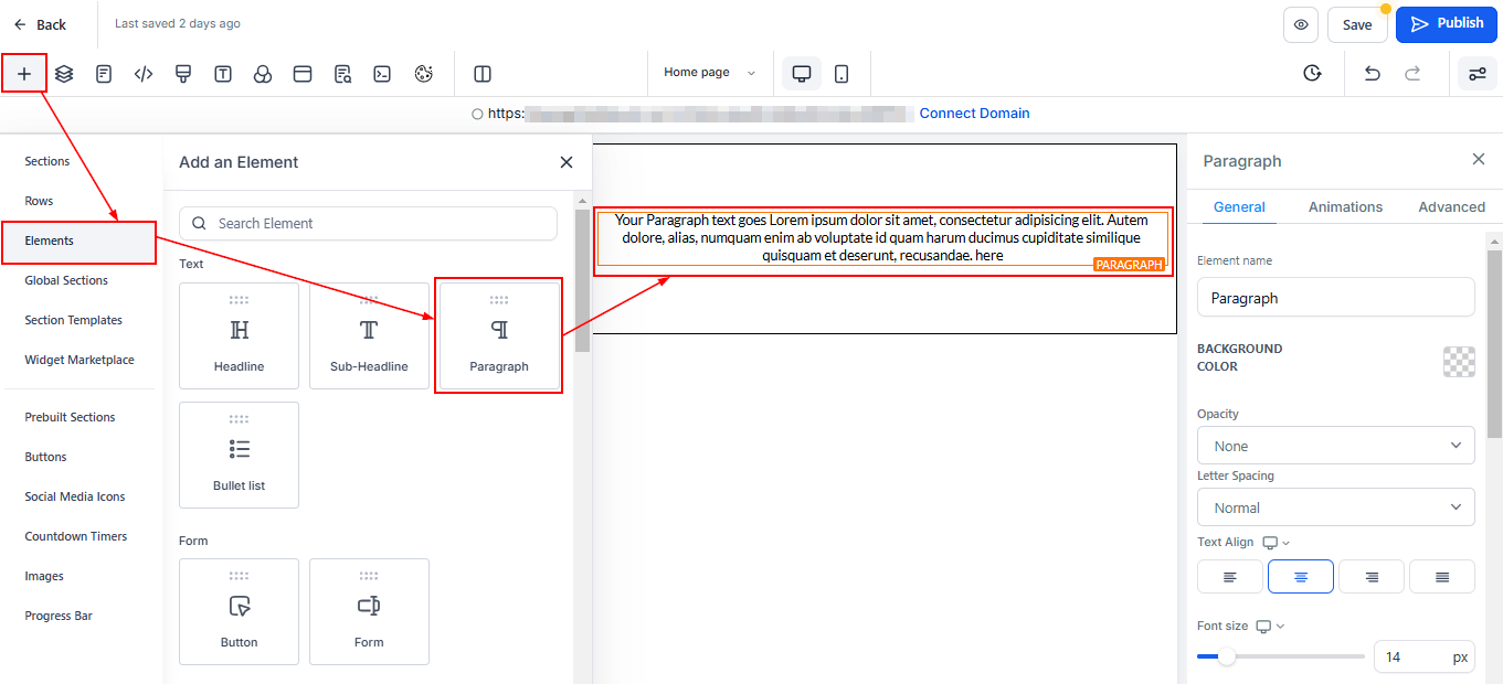 To integrate a paragraph into your page, simply drag and drop the Paragraph element into your desired location within the editor's workspace. Once placed, you can customize its appearance, font, and other attributes to align with your design preferences.