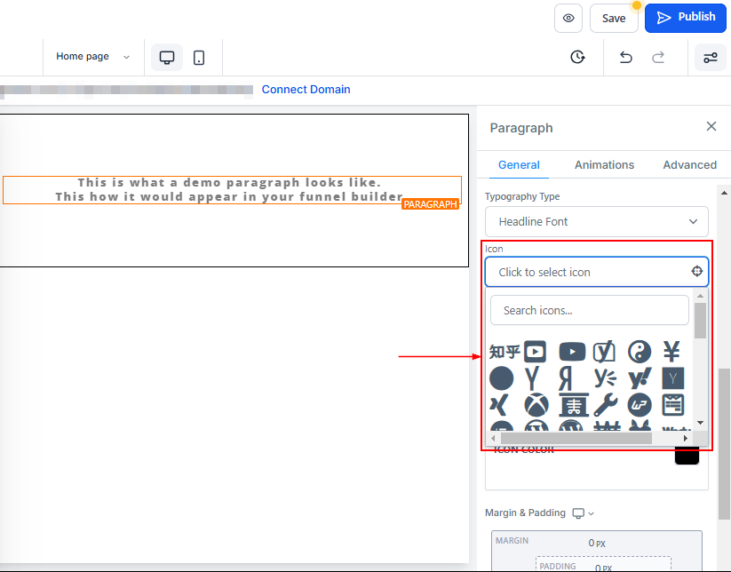 You can add an icon to your page by simply selecting from the available icon. If you have the desired icon in mind, you can type it into the search bar to narrow down the options.