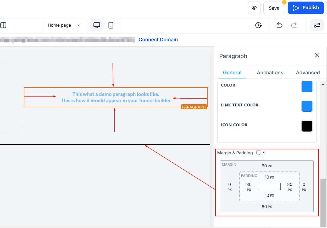 - Margin Top and Bottom: You can adjust the top or bottom margin of your content by toggling its bars.