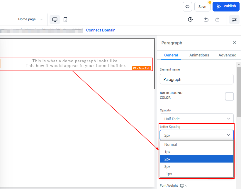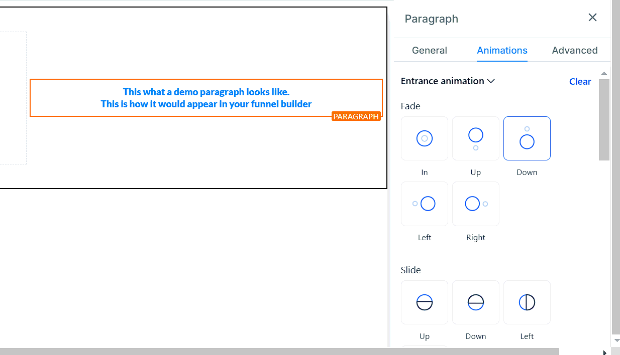Add an entrance animation to your paragraph to make it appear dynamically when the page loads. Choose from effects like Fade, Slide, Bounce, and much more to create a more engaging user experience.