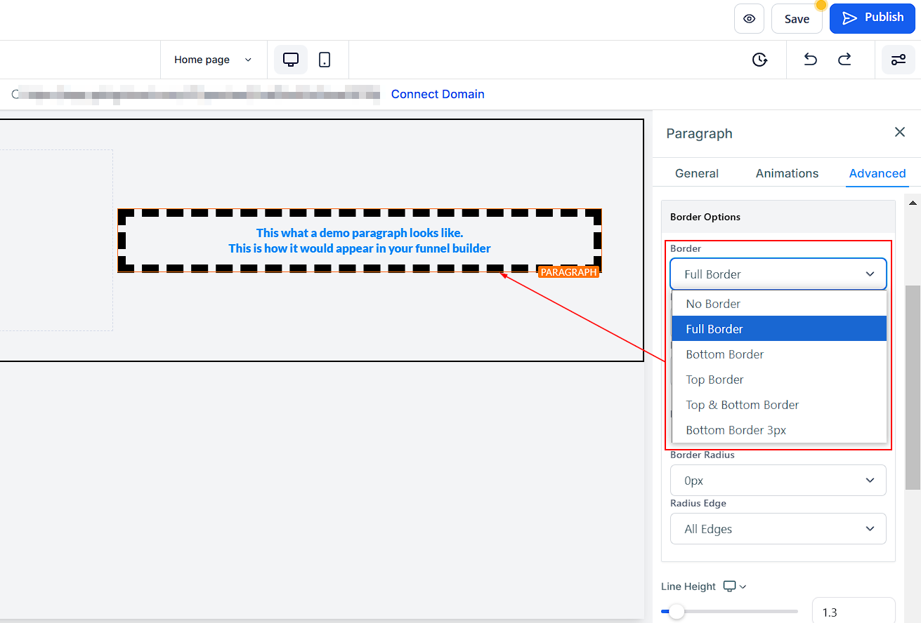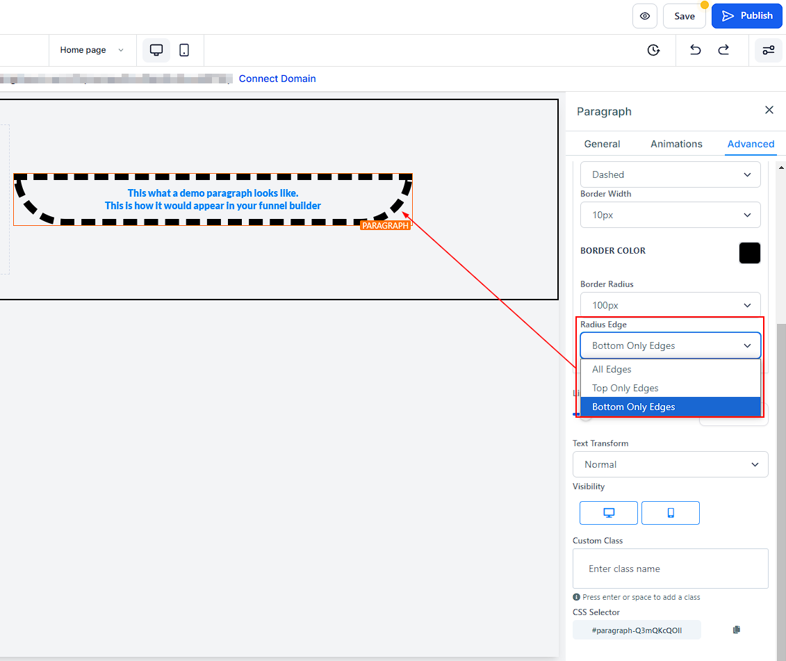 - Radius Edge: You can decide the corner of the border you want to curve, either all edges, Top only, or bottom edge only.