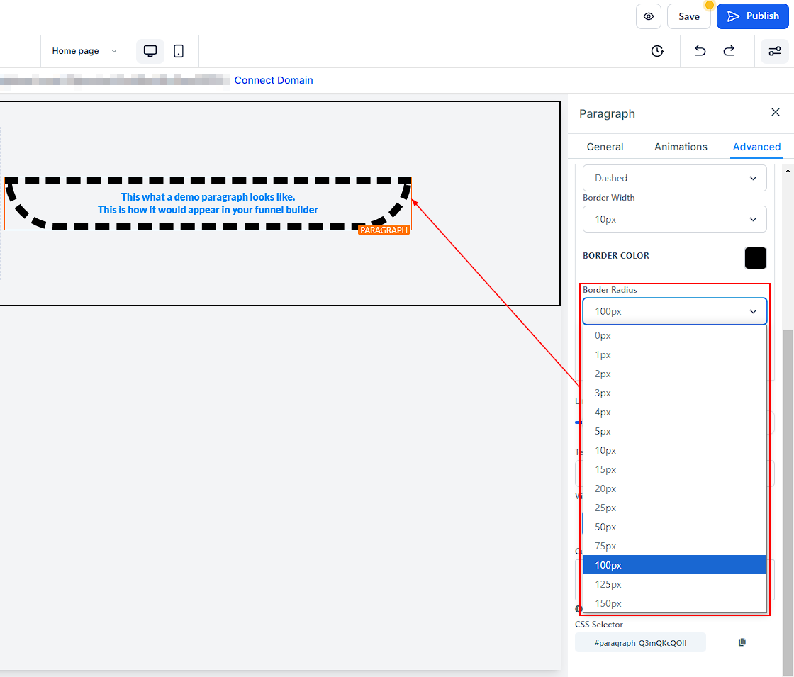 - Border Radius: Adjusting the radius of your border curves the edges of the border, the higher the number you select, the curvier it becomes.