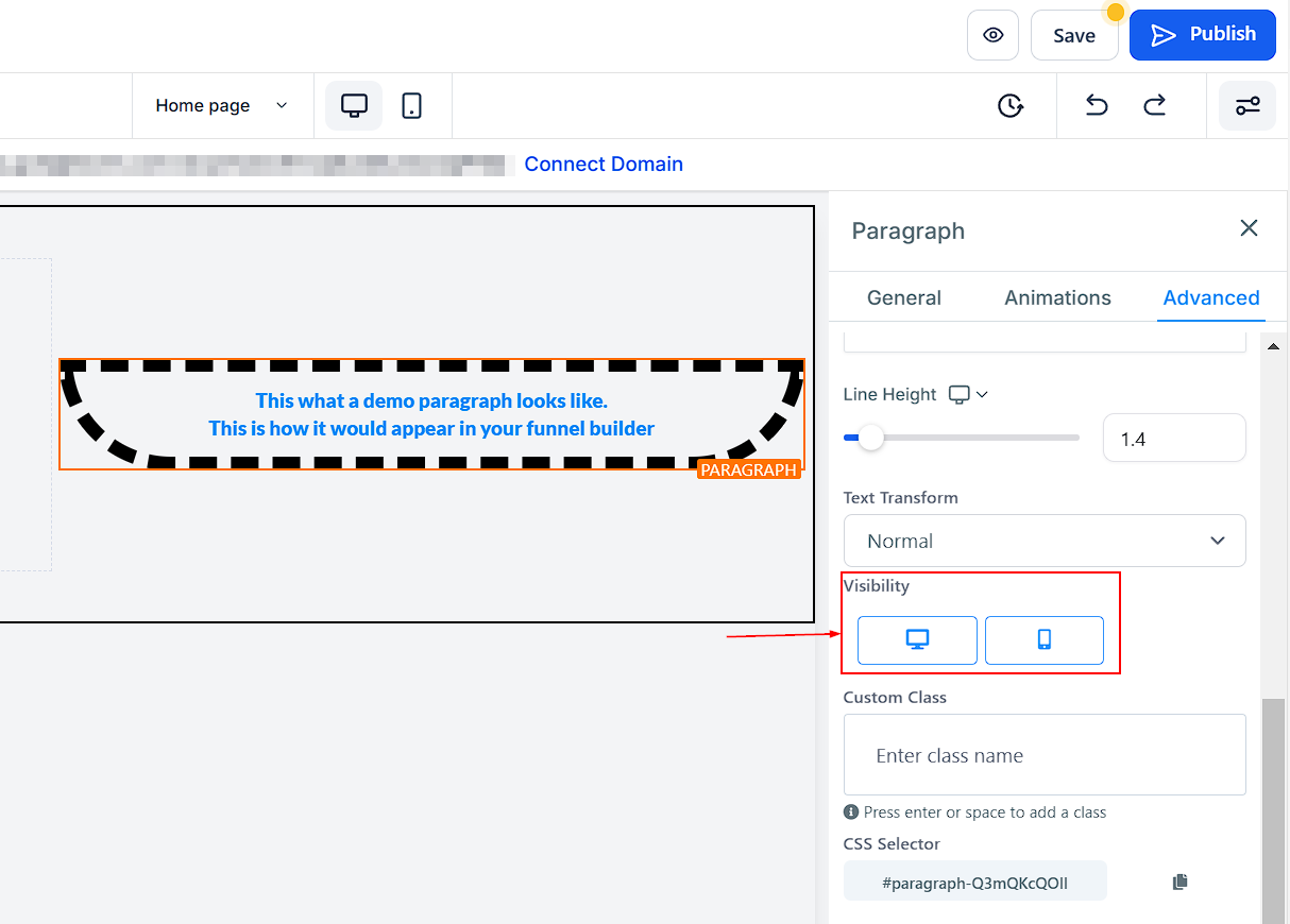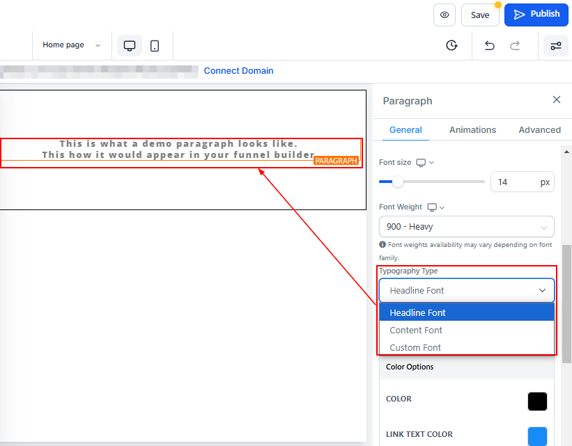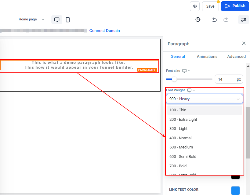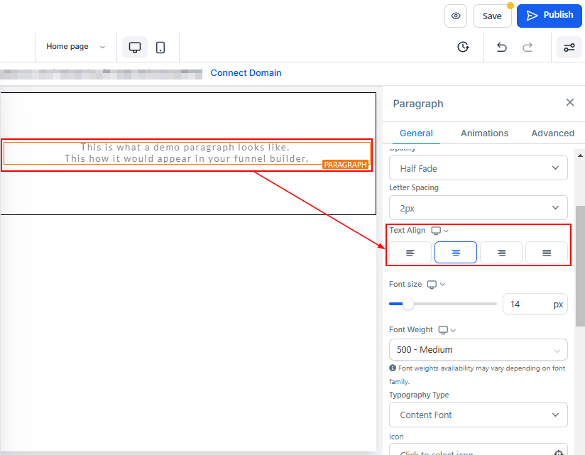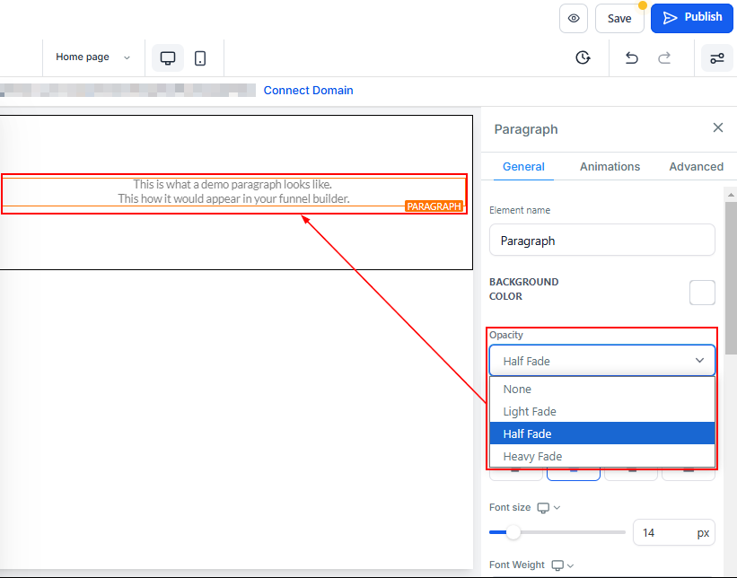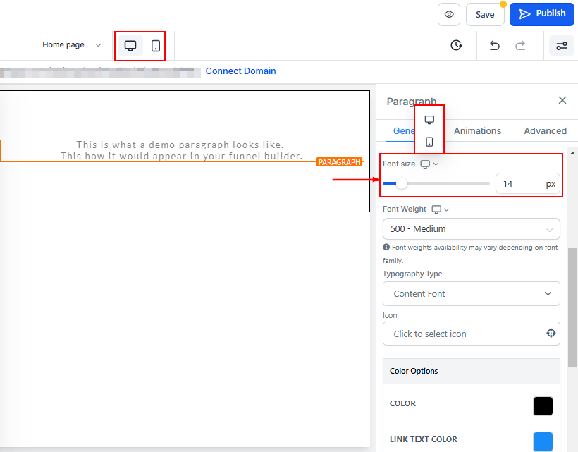 You can modify font size for mobile and desktop devices by using size bars for each text or content element. Toggle between mobile and desktop views in the top left corner of your funnel builder to see how your edits will appear on each platform.