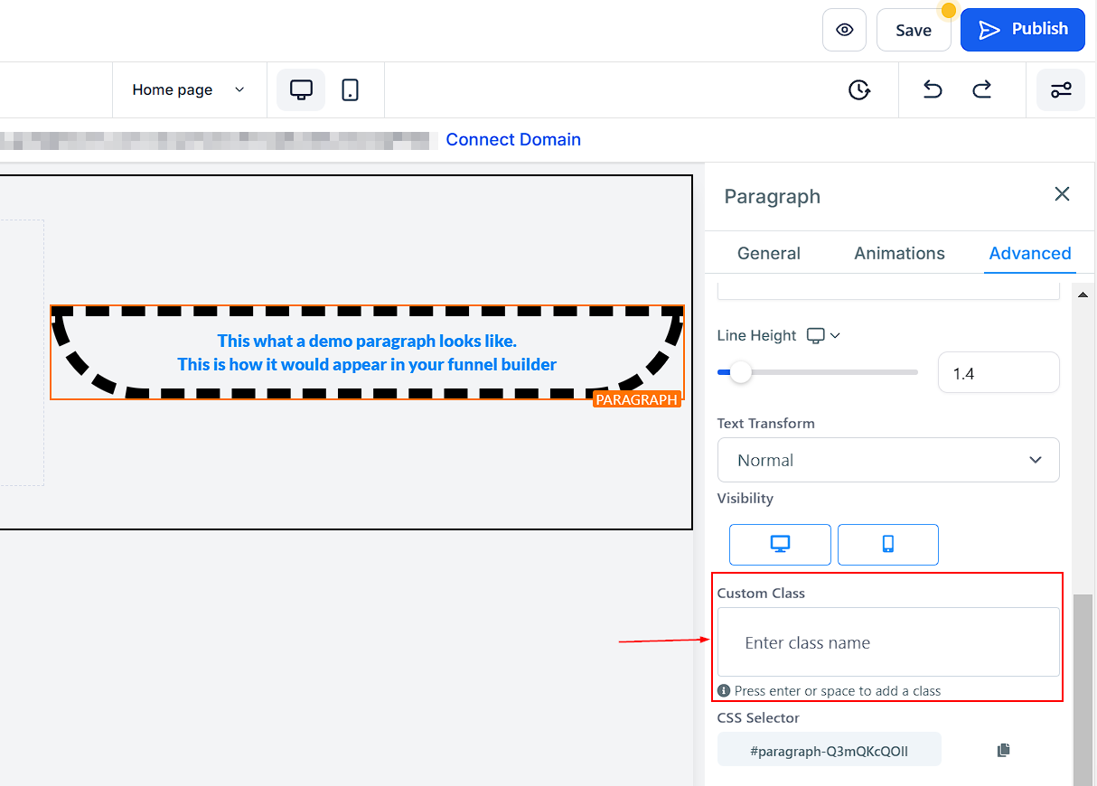To add a Custom Class, simply fill in the Custom Class field with your desired class name.