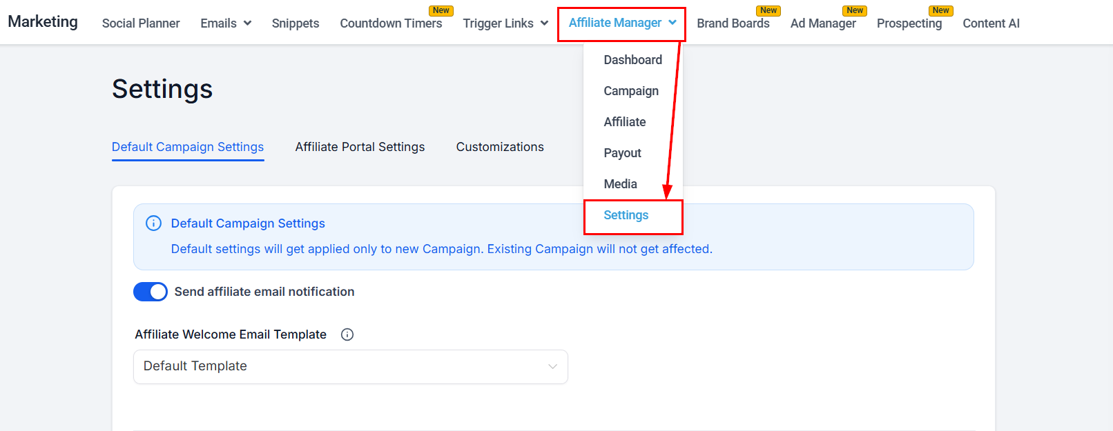Click the Settings option within the Affiliate Manager dropdown to access this section.