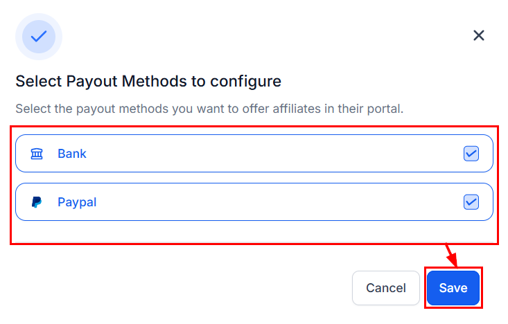 Once enabled, select the payout methods you want to offer affiliates in their portal.