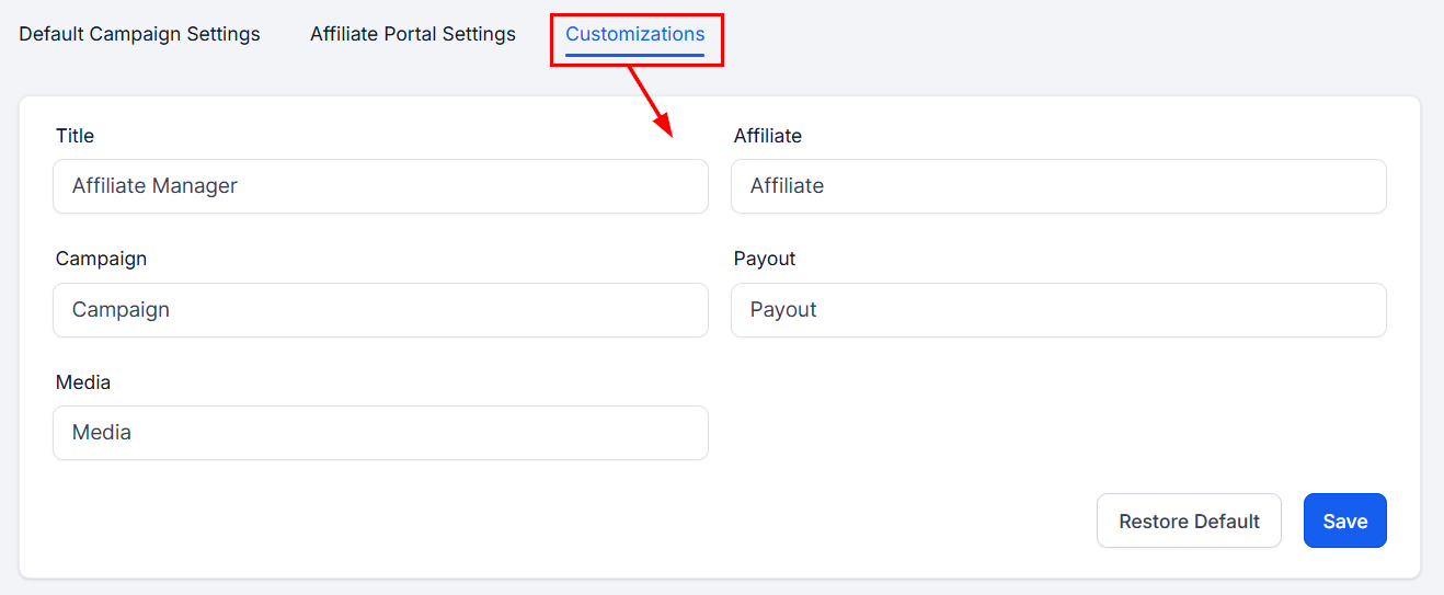 In the Customizations section, you can update the headers of the Affiliate Manager tabs to align with your preferences. These changes will be reflected in the Affiliate Manager drop-down.