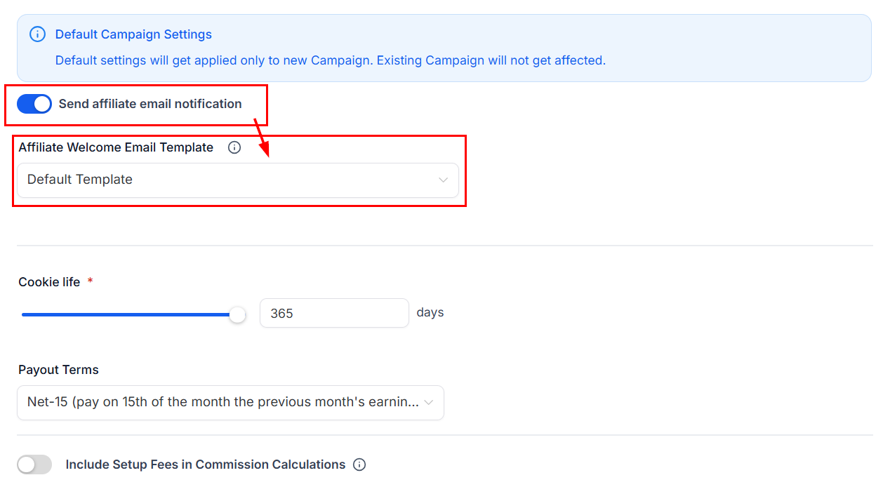Activate the Affiliate email notification to automatically send an email to new affiliates. Once enabled, choose a template from the drop-down menu or opt for the default template.